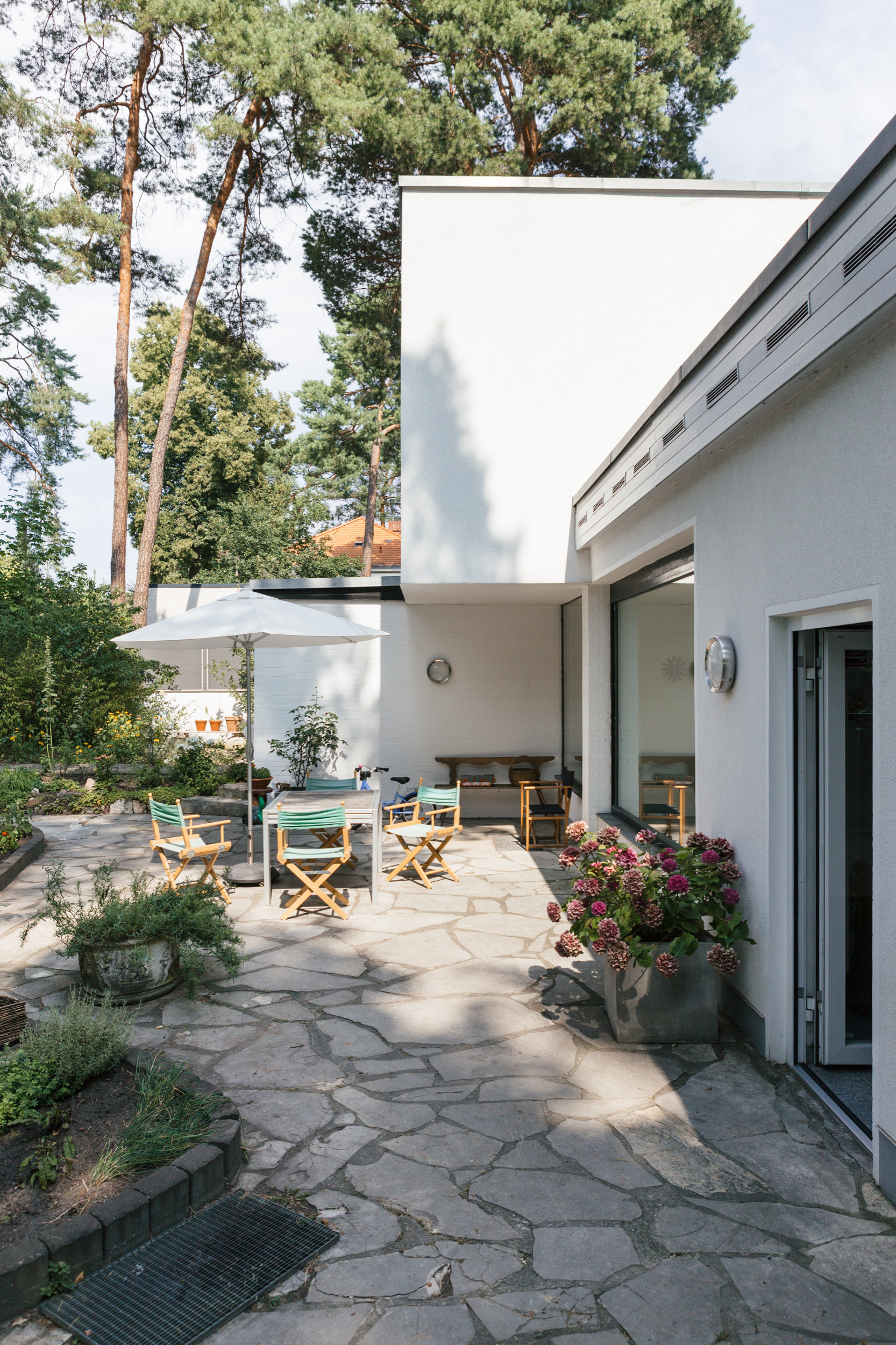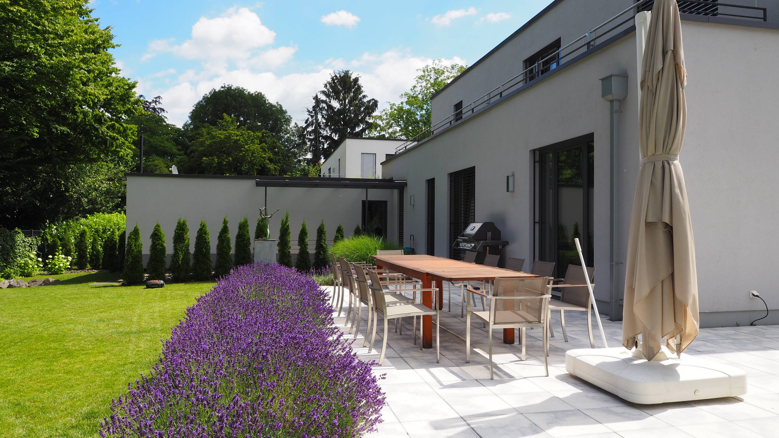Nicht immer ist ein Material das einzig Wahre. Bei Höhenunterschieden oder verschiedenen Funktionsbereichen kann es sehr wirkungsvoll sein, verschiedene Beläge miteinander zu mischen. Einen Teil dieser Terrasse gestaltete Landschaftsgärtner Stefan Heininger aus Dolomit-Stein aus dem Altmühltal, die Terrassendielen sind aus robustem Bambus.