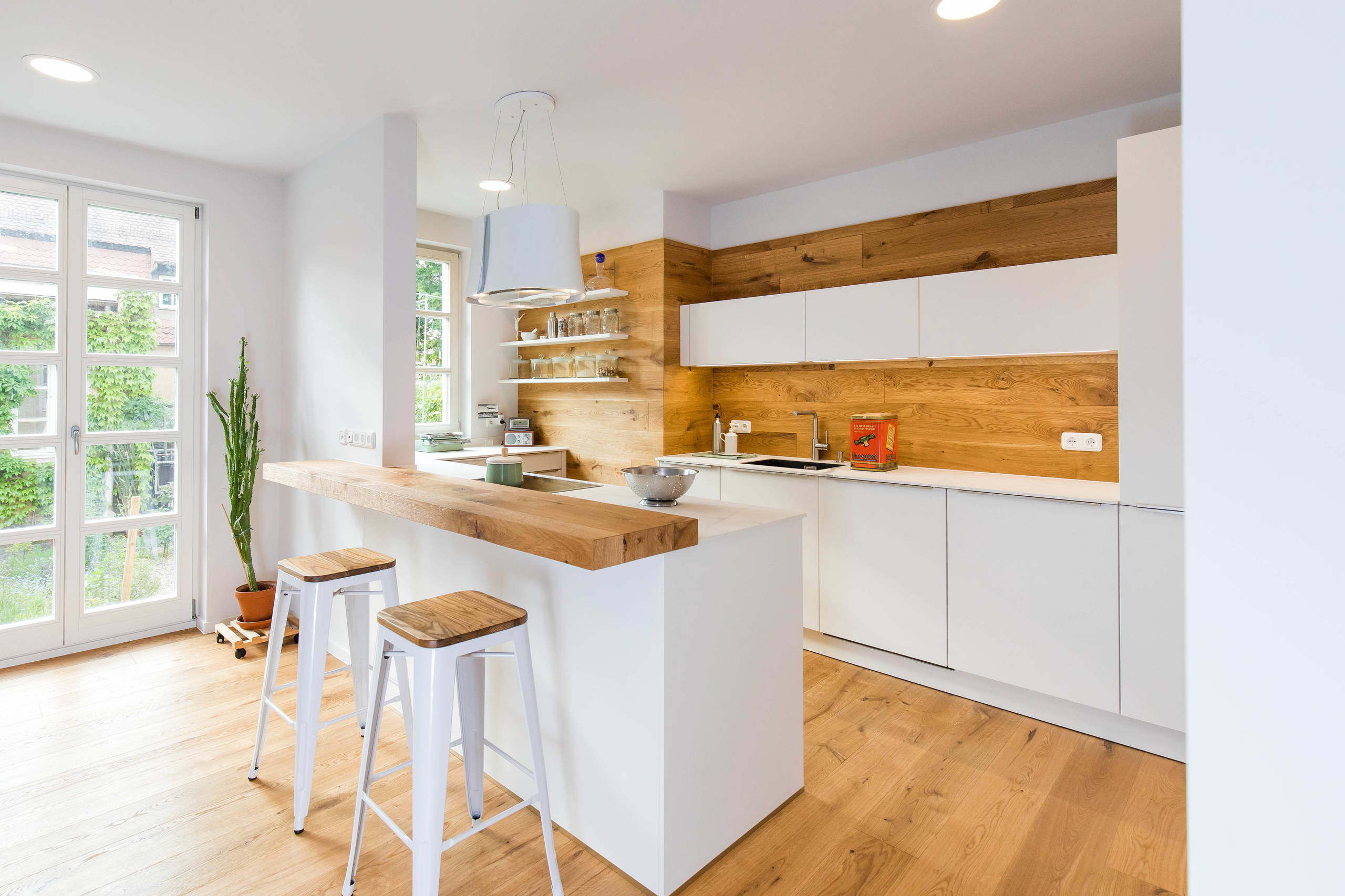In der offenen Küche einer Altbau-Wohnung in Nürnberg (Foto oben) kreiert der Holzbalken zwischen Kücheninsel und Trägerbalken einen Tresen, der den Raum harmonisiert und Großzügigkeit suggeriert. Rückwand, Boden und Pultplatte sind aus dem gleichen geölten Parkett und wurden vom Unternehmen WerkraumKüche gefertigt.