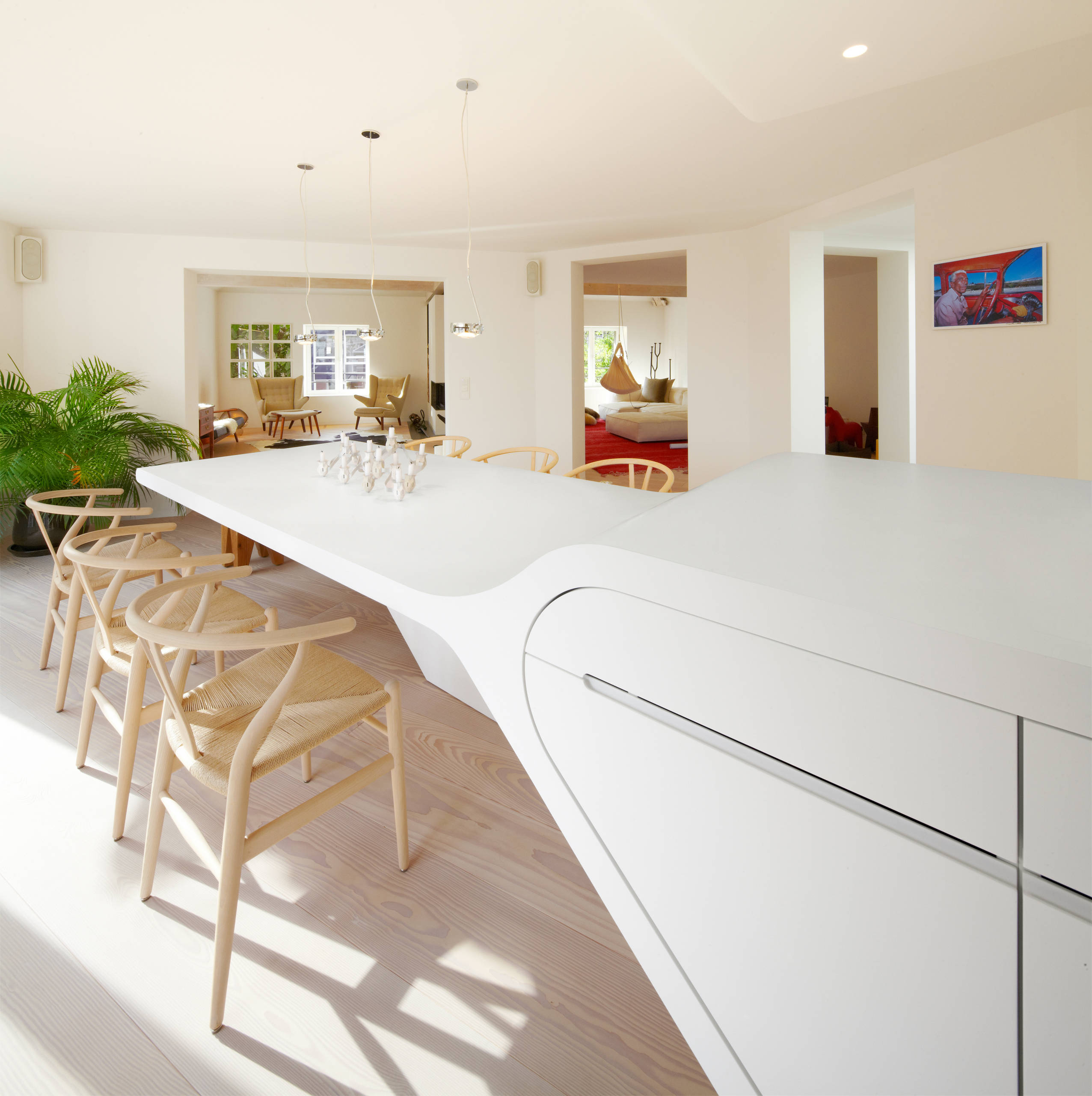 Futuristisch schwungvoll geformt, schießt dieser Tresen von Schmidt Holzinger Innenarchitekten in den Raum und geht dann fließend in einen Esstisch über. Solch eine individuelle Küchentheke lässt sich nicht selber bauen. Der Küchenprofi hingegen weiß, wie durch Materialwahl, Farbe und Form sich mit einer Küchentheke der Raum abwechslungsreich und spannend gestalten lässt.