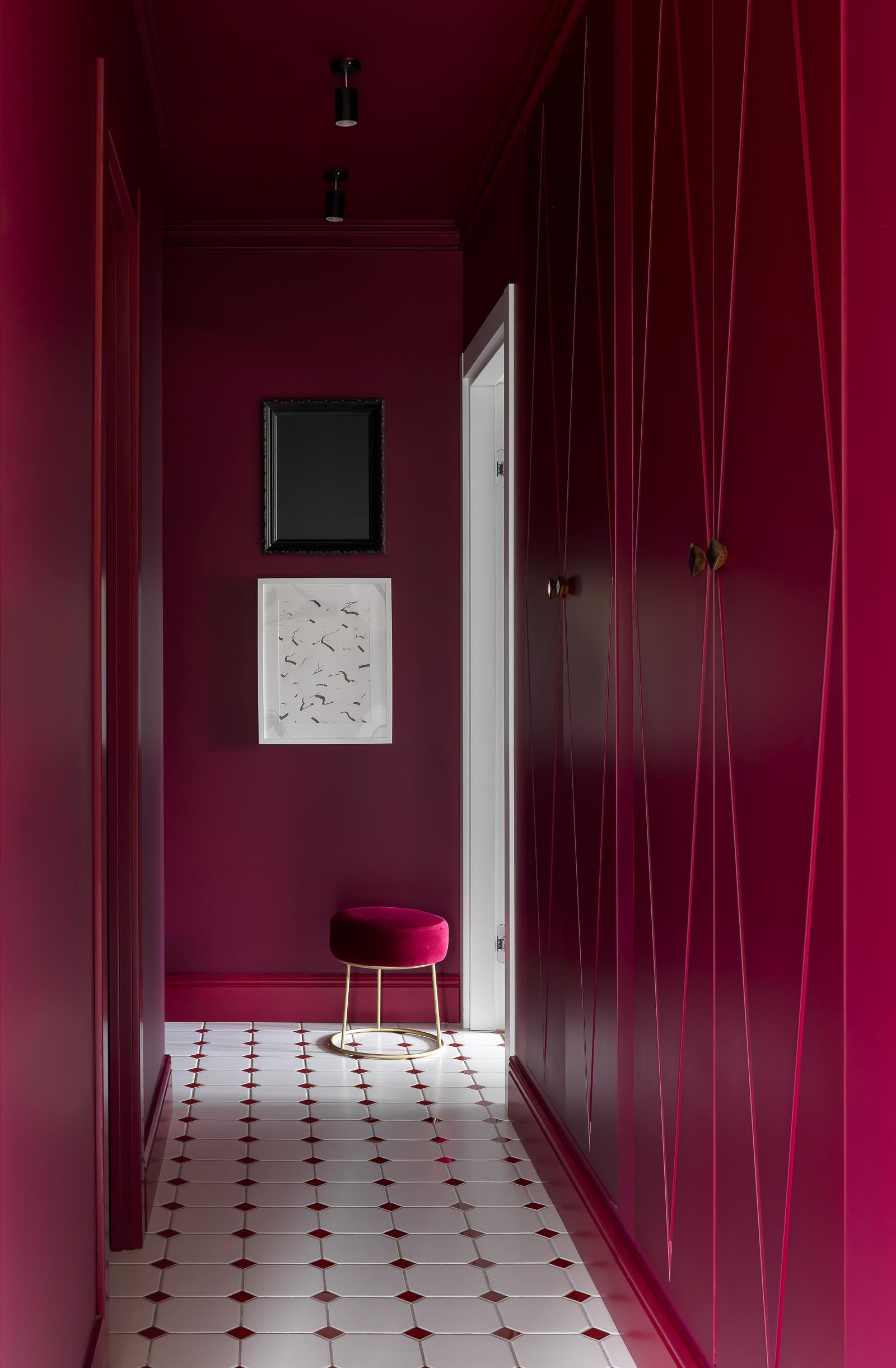 ► Die Wände dieses Korridors in einer Moskauer Wohnung sind gänzlich monochrom, sogar Decke und Schranktüren wurden burgunderfarben gestrichen – so wird der Flur zum Erlebnis.