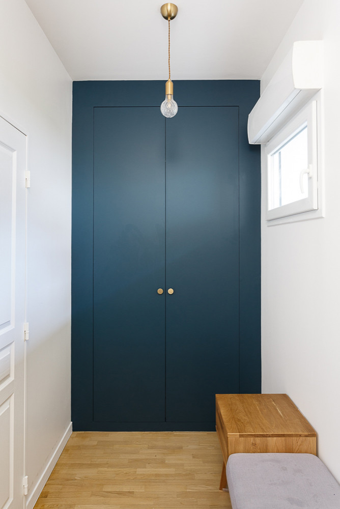 3. Ein guter Trick, einem weißen Flur etwas Farbe zu verpassen: die Stirnseite dunkel streichen oder wie in diesem Beispiel den Einbauschrank. Durch diesen Farbtrick verliert ein langer Flur zudem seine Korridorwirkung. Langgestreckten Räumen kann man so durch eine gute Farbgestaltung zumindest optisch zu besseren Proportionen verhelfen.