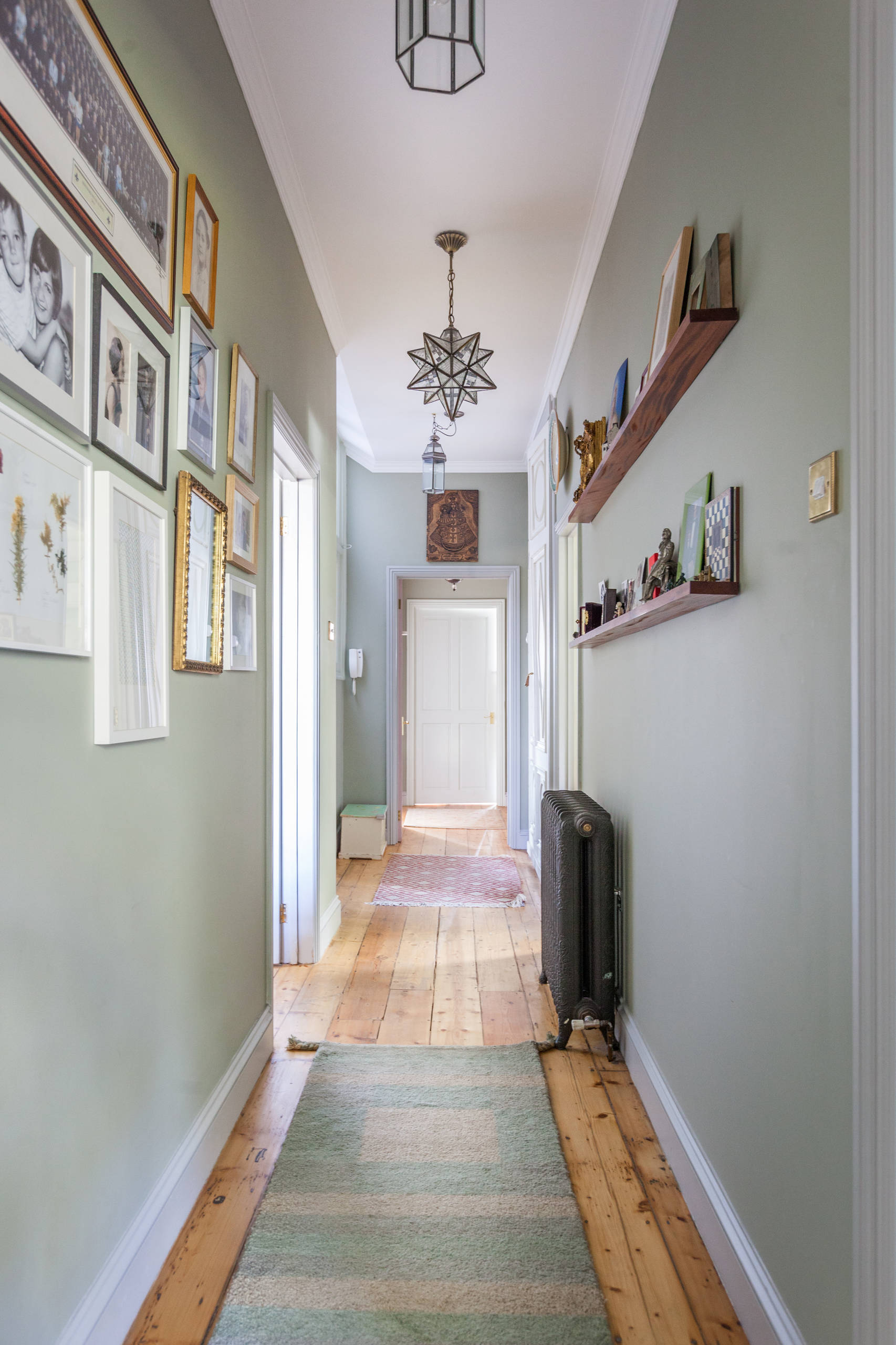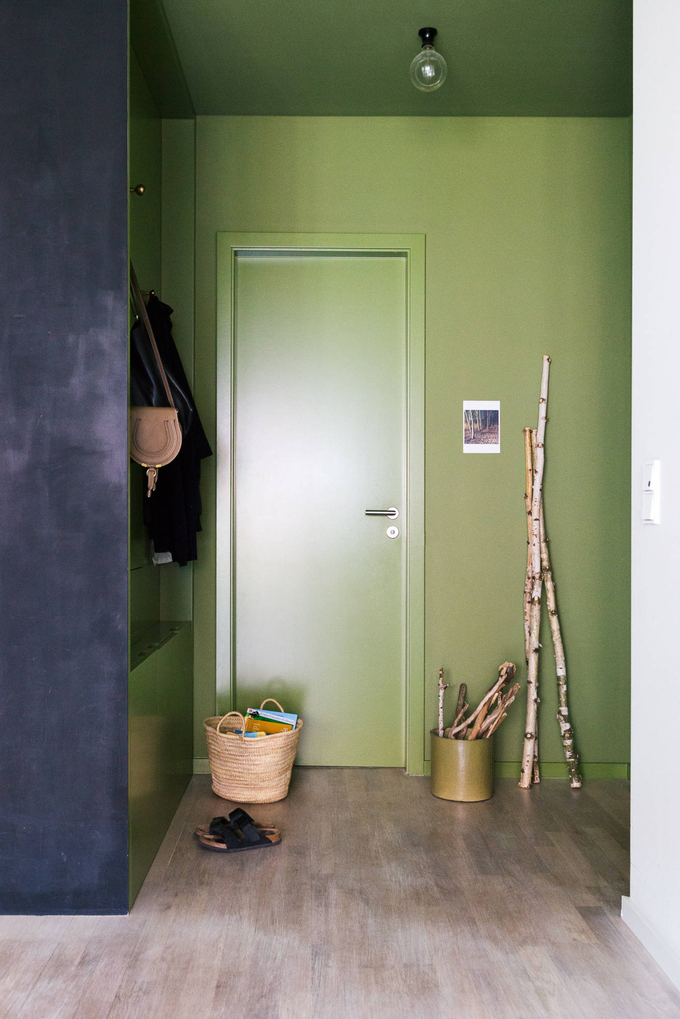 2. Grün ist eine hervorragende Farbe für den Flur, weil die Flurfarbe Sie in einer beruhigenden Umgebung zu Hause begrüßt. Vielleicht ist es der Bezug zur Natur, der dazu beiträgt, dass die Farbe Grün ausgleichend wirkt. In einem Miniflur wie diesem ohne Tageslicht eignen sich besonders komplexe Grüntöne wie Oliv oder Pistazie, da sie sowohl warme als auch kühle Anteile enthalten, zudem modern wirken.