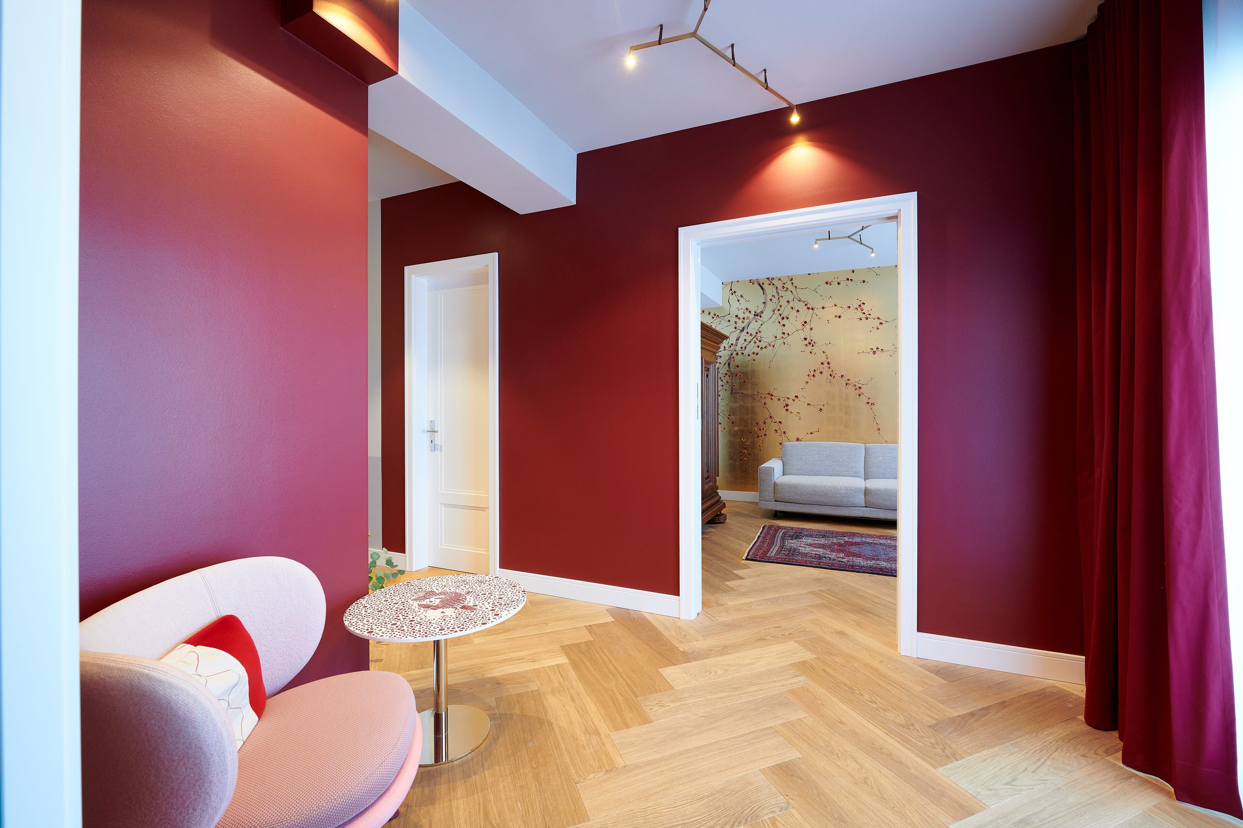 6. Dunkle rot- und blauviolette Beerentöne stecken voller Power und geben als Wandfarbe diesem Flur, den JUNG&KLEMKE in einer Frankfurter Wohnung gestaltet haben, einen würdevollen Charakter. Extrem klassisch und elegant wirkt die Wandfarbe in Kombination mit den Holzdielen sowie weiß gestrichenen Türen und Scheuerleisten.