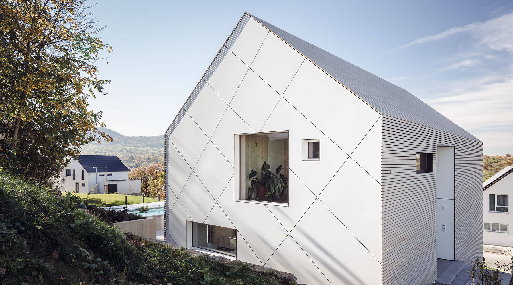 3. HPL-Fassadenplatten. HPL versus Weißtanne: Dieses puristische Holzhaus in Hanglage, ein Entwurf von HI Architektur, lebt äußerlich von einem spannenden Materialkontrast. So ist die Querseite des Hauses mit längs verlaufenden, vorgegraut lasierten Schalungsbrettern aus Weißtanne verkleidet, während die Stirnseiten von großformatigen, diagonal montierten HPL-Fassadenplatten bedeckt sind. Sie betonen die Hanglage des Hauses und bringen Dynamik in die Fassadengestaltung.