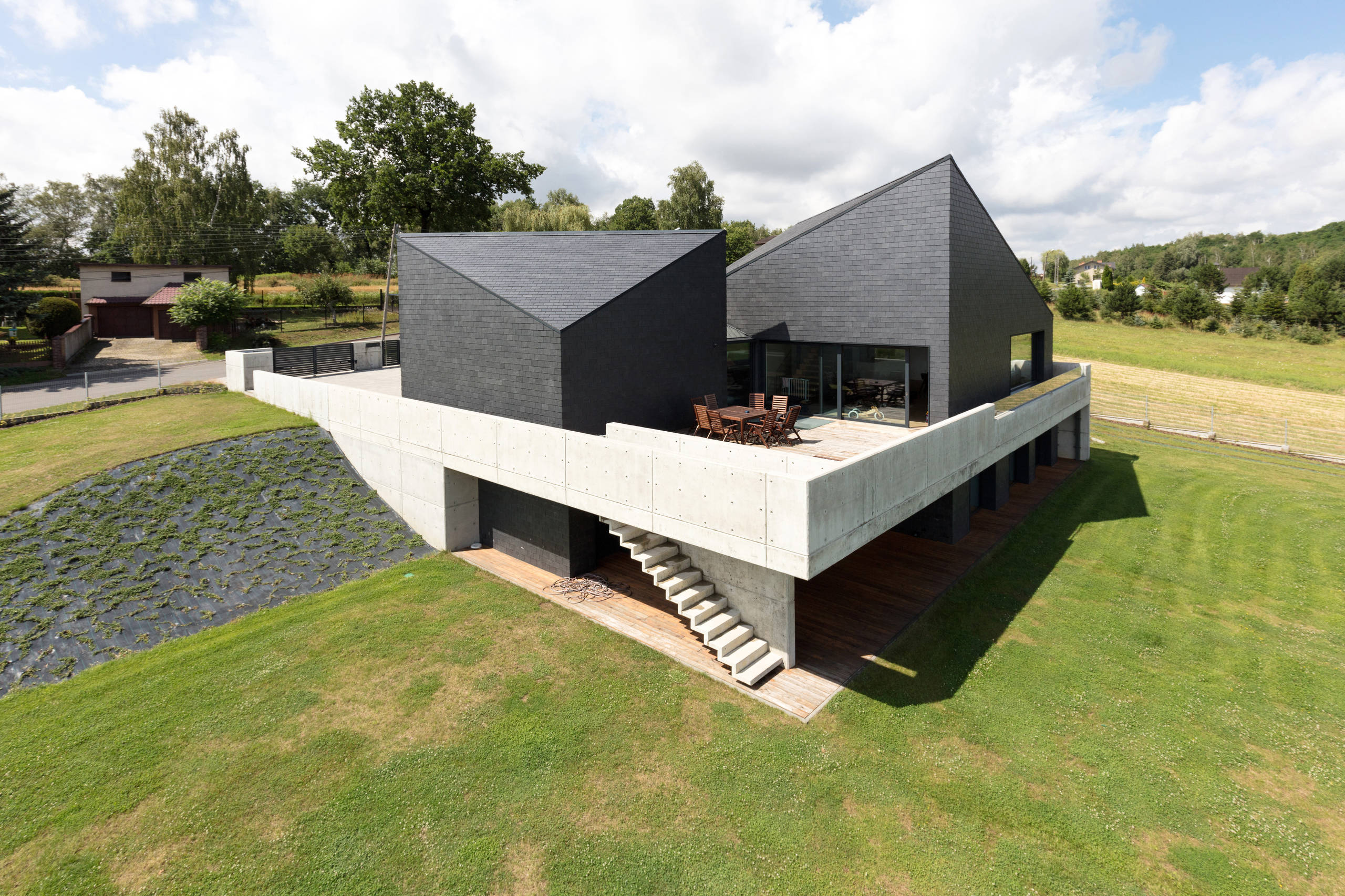 6. Schiefer. Schieferplatten überlappend auf einer Holzkonstruktion – dieses monolithische Bauwerk sticht dank des dunklen Naturmaterials in Kombination mit rohem Beton fast schon brutal aus der Umgebung heraus. Der Schiefer selbst überzeugt mit bauphysikalischen Vorzügen: Er ist robust, langlebig, pflegeleicht und äußerst witterungsbeständig. So amortisieren sich die etwas höheren Kosten im Vergleich zu dem Naturmaterial Holz schnell.