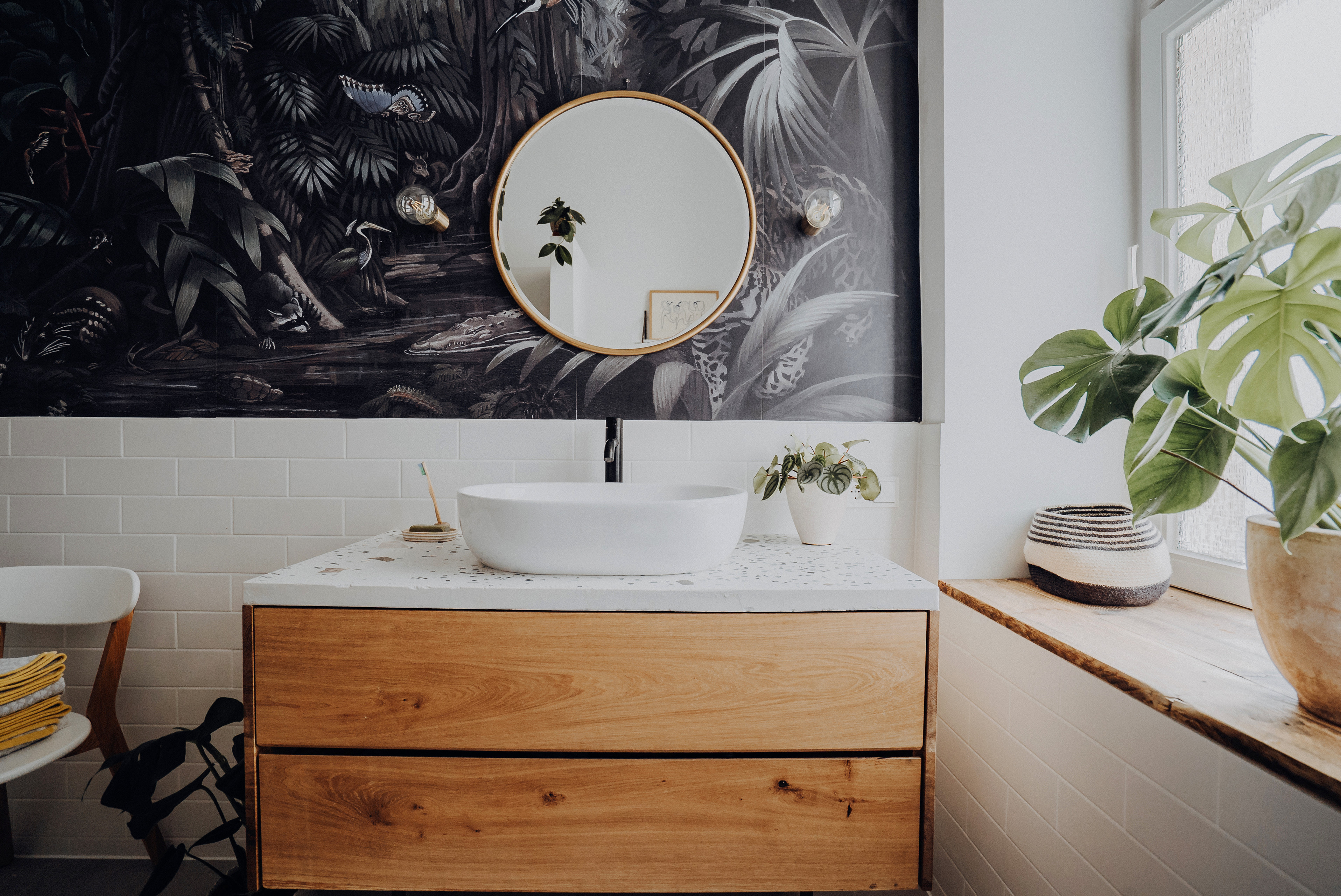 Der neue schwarze Wasserhahn ergänzt sich wunderbar mit der Dschungel-Tapete und dem neuen Spiegel aus gebürstetem Messing.