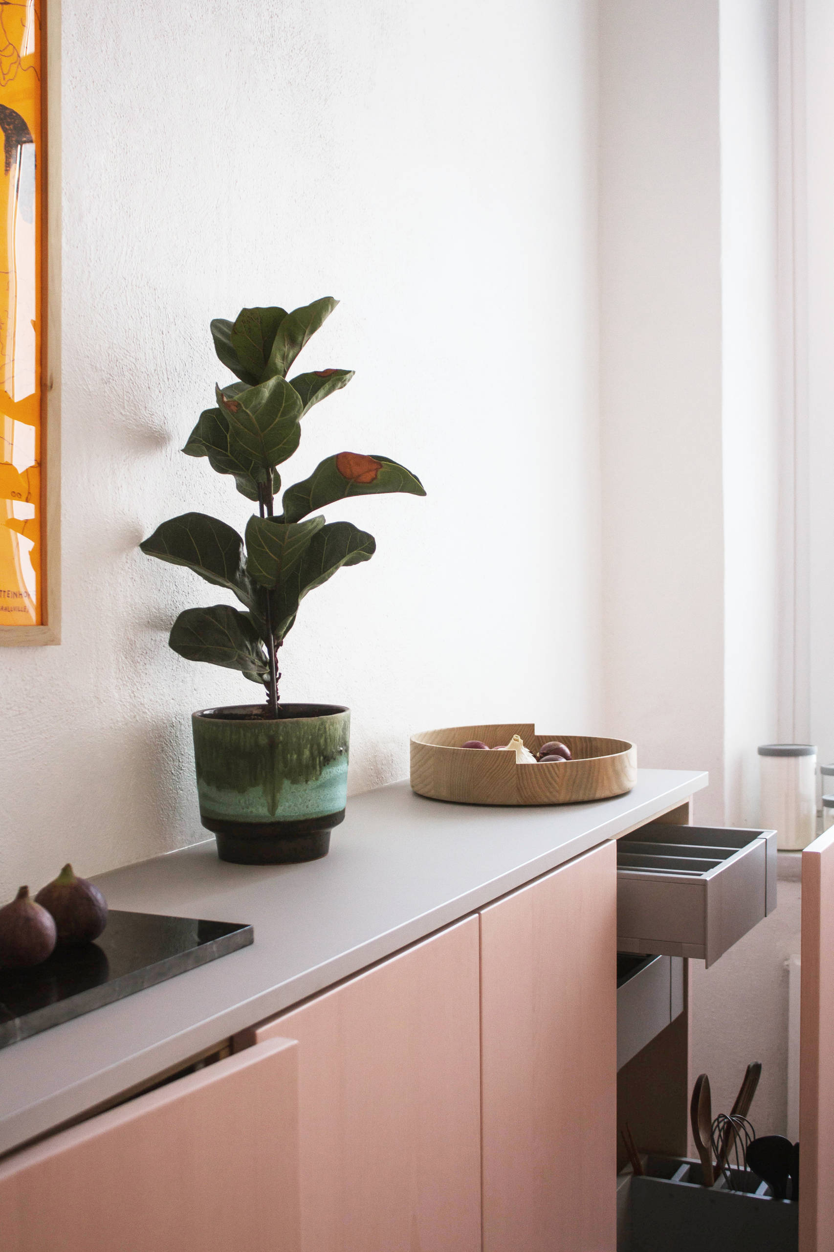 Mit matt grauer Arbeitsplatte aus Fenix ergänzten Gerdesmeyerkrohn diese zartrosa Küche in einer Hamburger Wohnung.