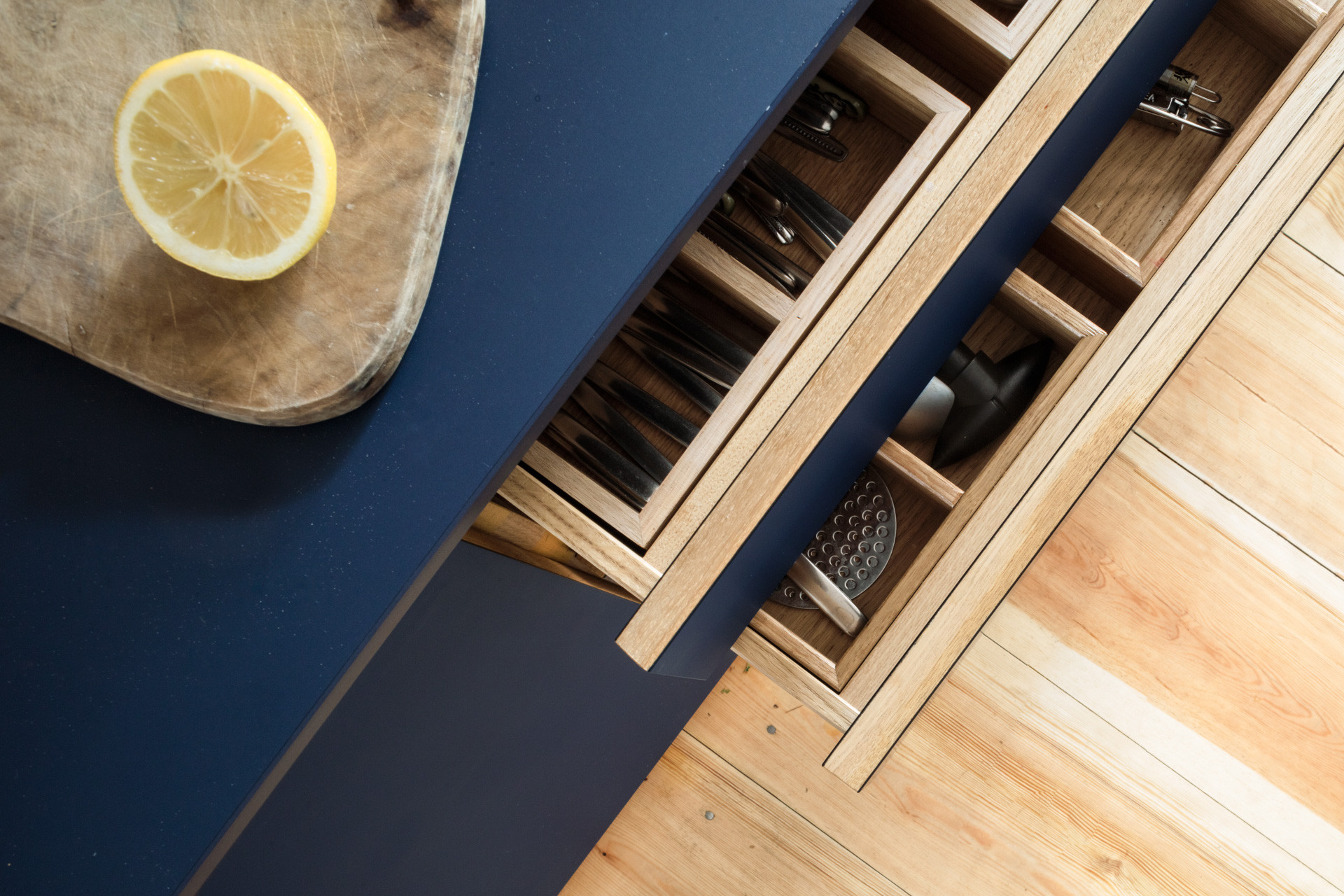 Eindeutig die Hauptrolle spielt in dieser Küche dunkelblaues Fenix für Arbeitsfläche und Fronten.