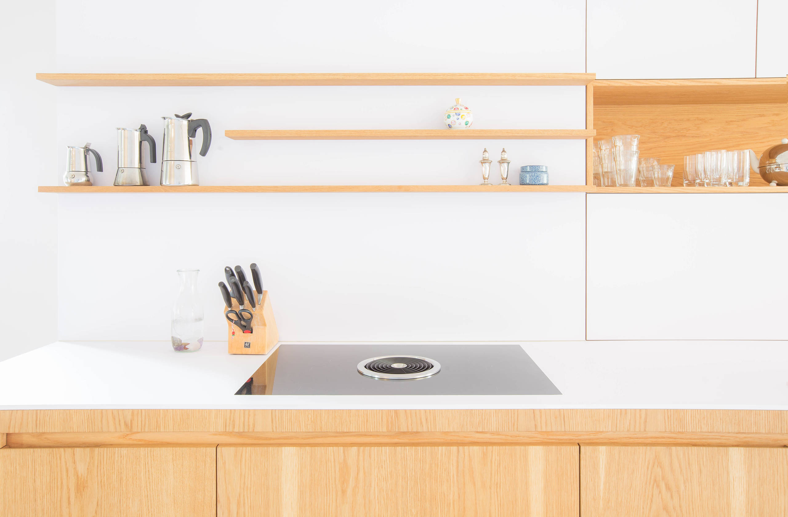 Ein Teil der Fronten sowie die Rückwand einer offenen Wohnküche für ein Reihenhaus in Garmisch-Partenkirchen bestehen aus Platten mit überfurniertem Fenix-Schichtstoff mit Eichenkanten. Damit alles nicht zu steril wirkt, haben Lars Popp & Friends auch Elemente aus Holz integriert.