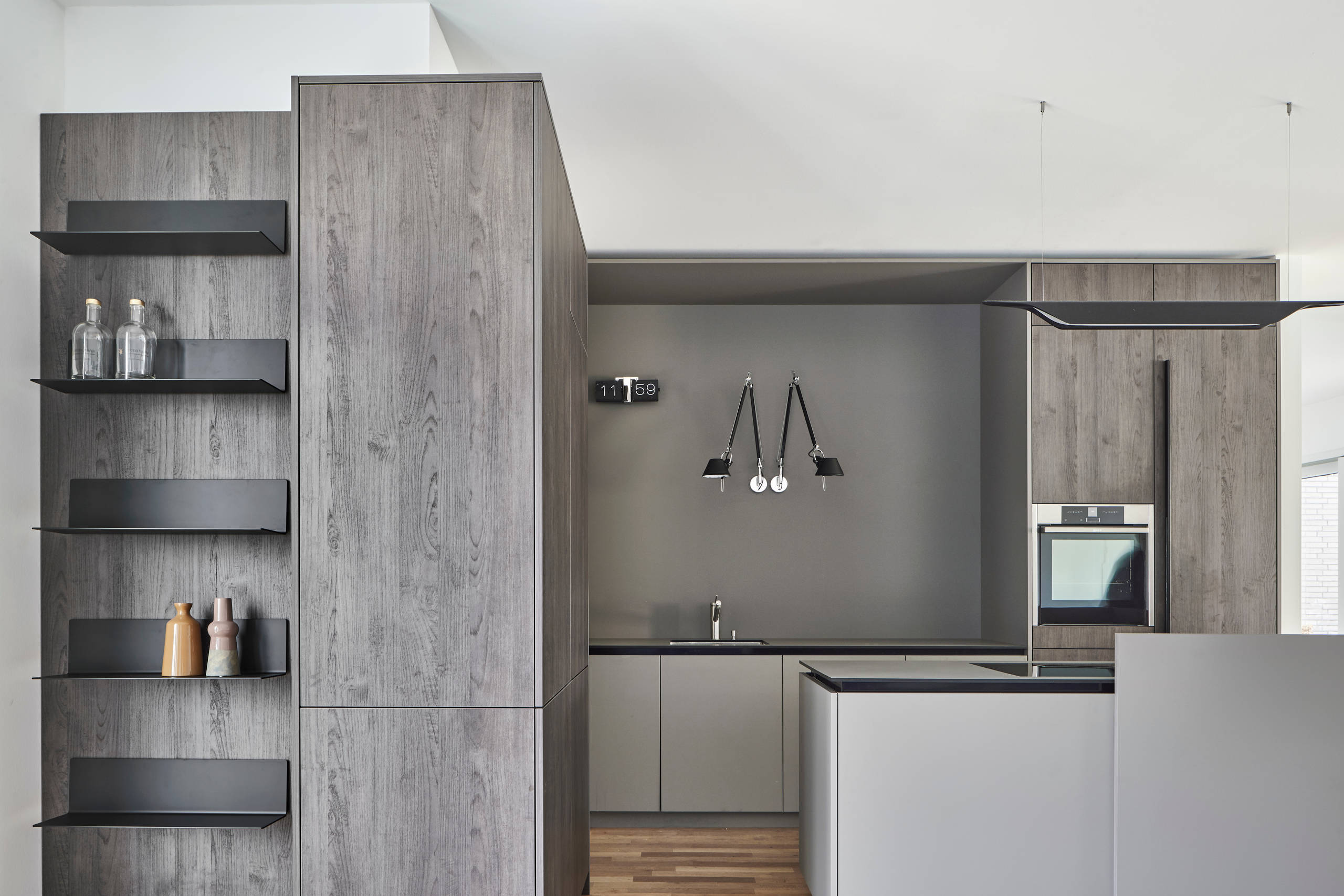 Grau in grau gestalteten Studio1073 diese Kölner Küche – mit einer auf die Küchenfronten farblich abgestimmten Fenix-Arbeitsplatte.