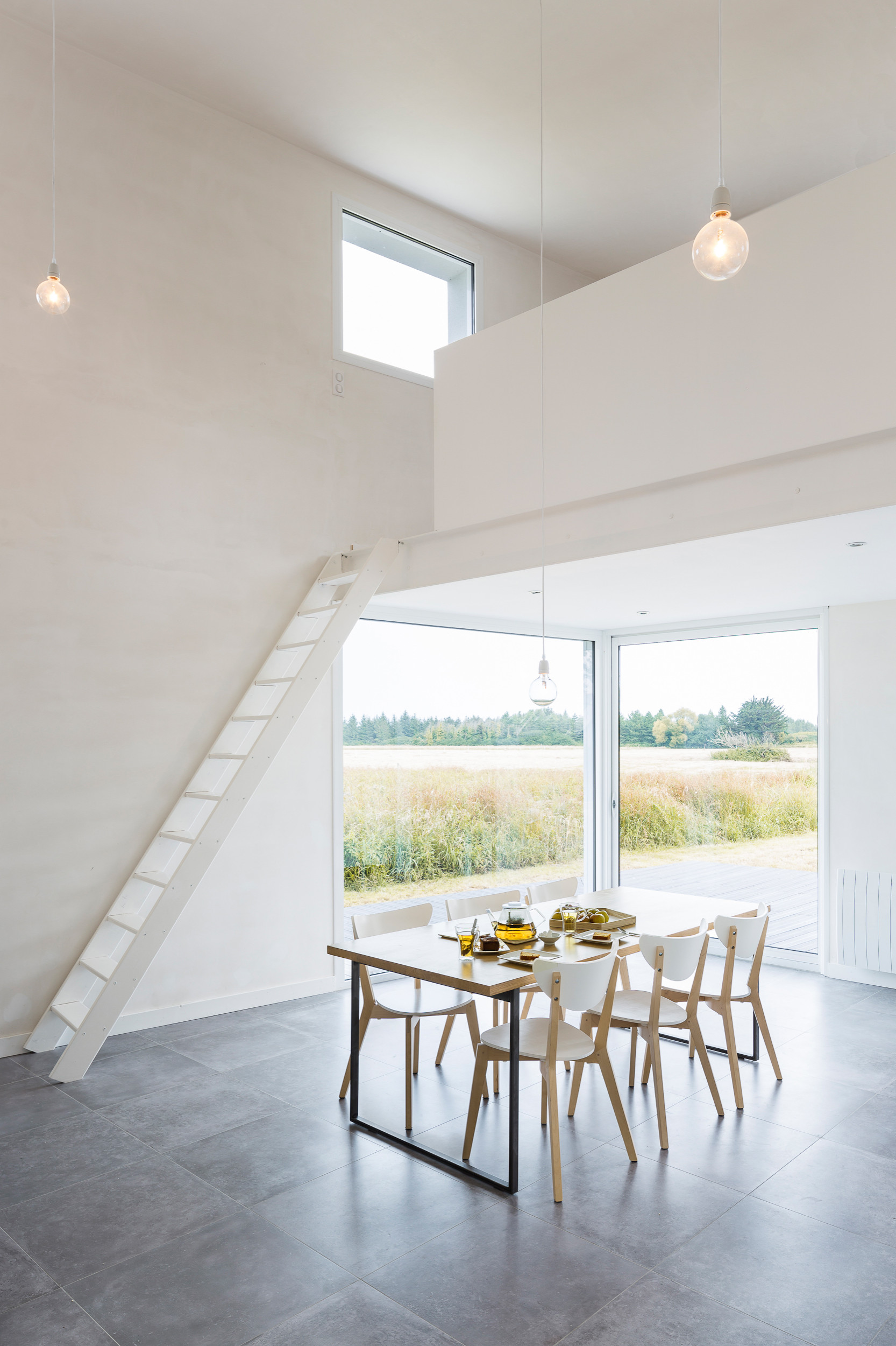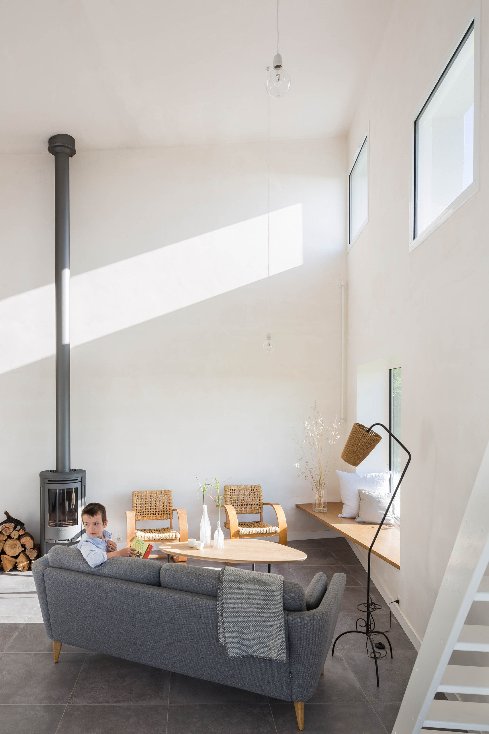 Die Innenwände sind schlicht weiß verputzt, was dem Raum sowohl eine sanfte als auch eine rohe Note verleiht. „Wie schon für die Fassade haben wir auch für den Innenbereich ein schlichtes Design vorgeschlagen, samt großem Wohnzimmer mit sehr hoher Decke sowie offenen Zwischenetagen, die über Leitern zugänglich sind.“