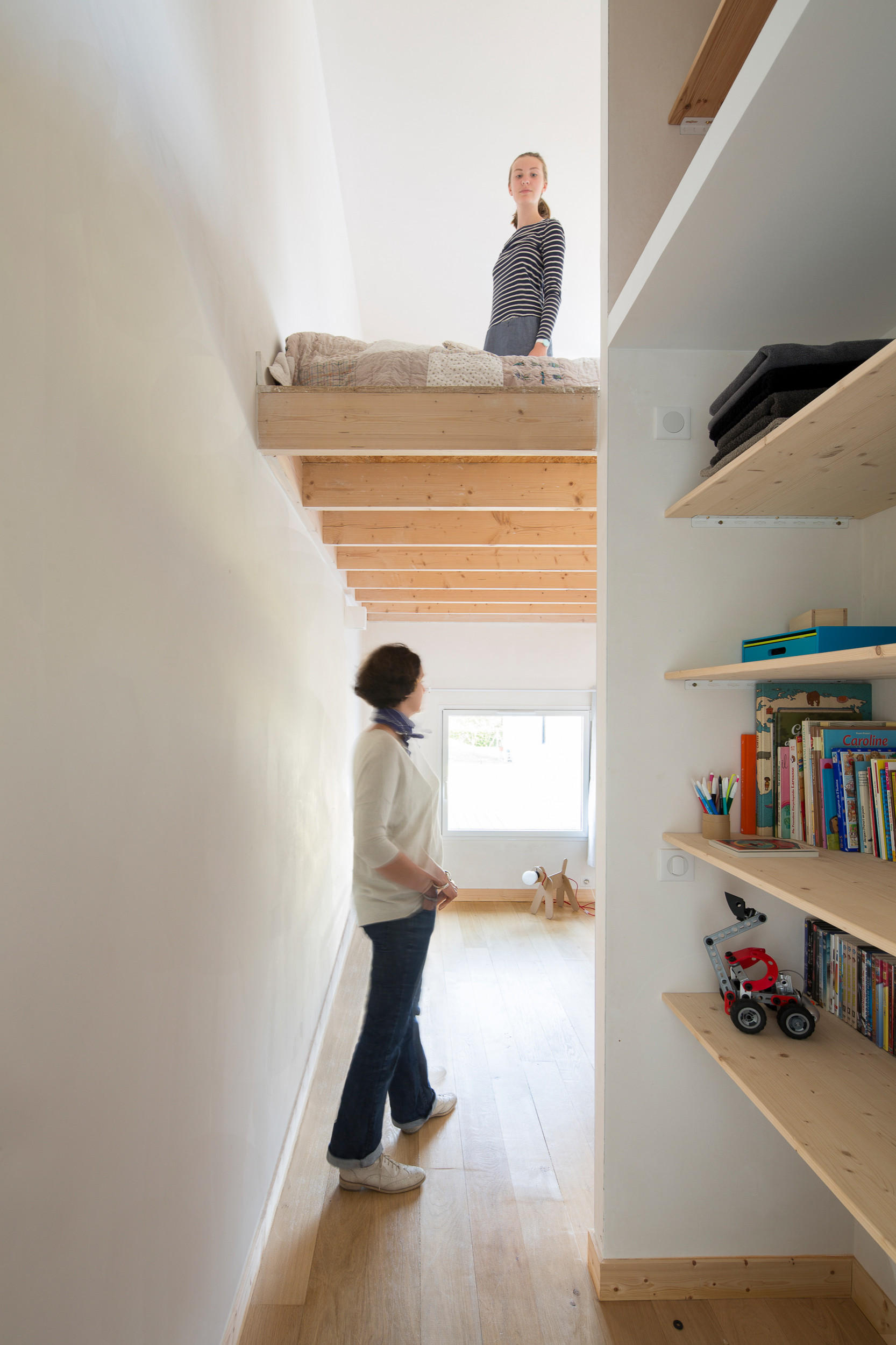 Die zwei jugendlichen Kinder haben jeweils ein eigenes Zimmer mit Zwischenetage und einem En-Suite-Badezimmer, das in eine Ecke des Zimmers eingebaut wurde. Um den Platz optimal zu nutzen, befinden sich in dem kleinen Flur jede Menge Regale für Bücher & Co.