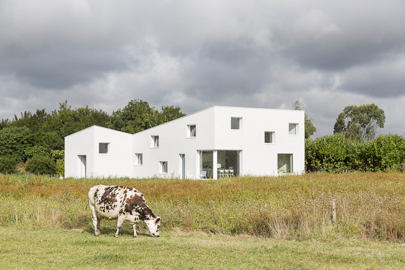 Dieses von Studio Razavi entworfene Wohnhaus ist im Dialog entstanden: Der Bauherr, ein Fotograf, gab dem Architektenteam viele Impulse für das Heim, das ihm für sich und seine Familie vorschwebte. Mitten auf der grünen Wiese errichtet, wirken heute alle Ausblicke des L-förmigen Gebäudes wie Landschaftsaufnahmen. Im Südflügel hat sich der Hausherr sein Fotostudio eingerichtet. Dank asymmetrischer Form und minimalistischem Design ist der monolithische Bau ein echter Blickfang.
