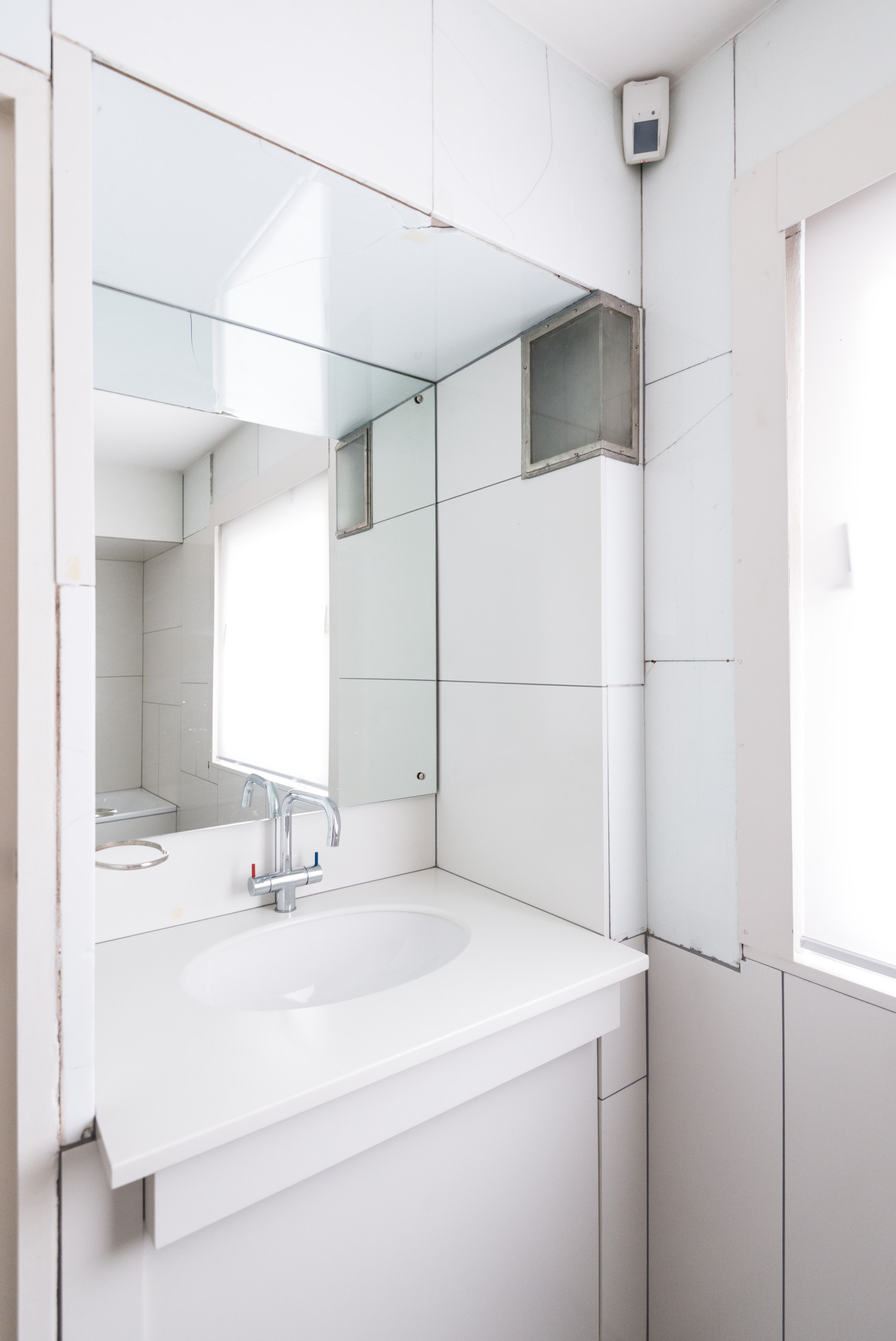 Bei den Fußleisten und Wandverkleidungen in Küche und Bad handelt es sich nicht um keramische Fliesen, sondern um weiß, schwarz und rot eingefärbtes Opakglas.