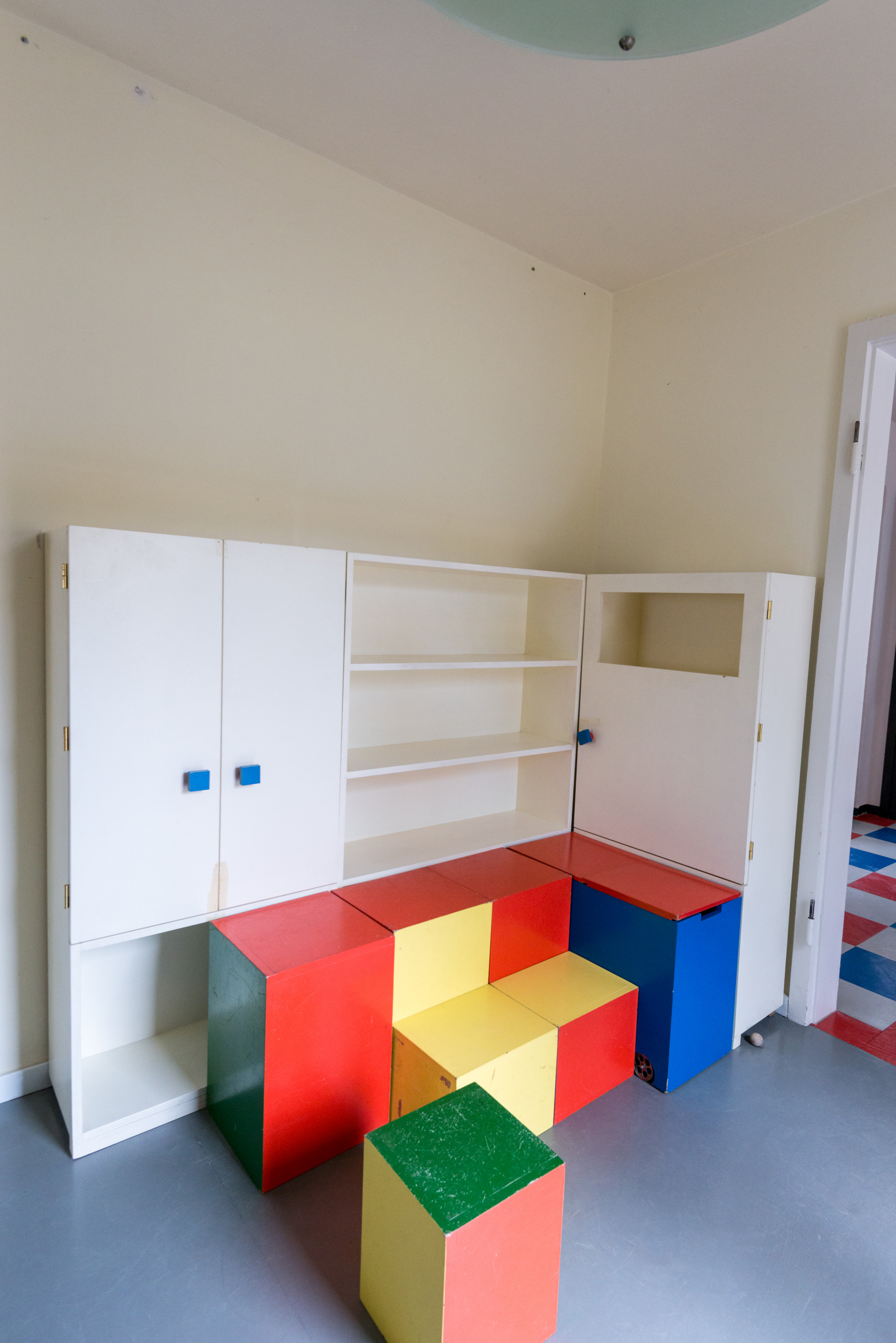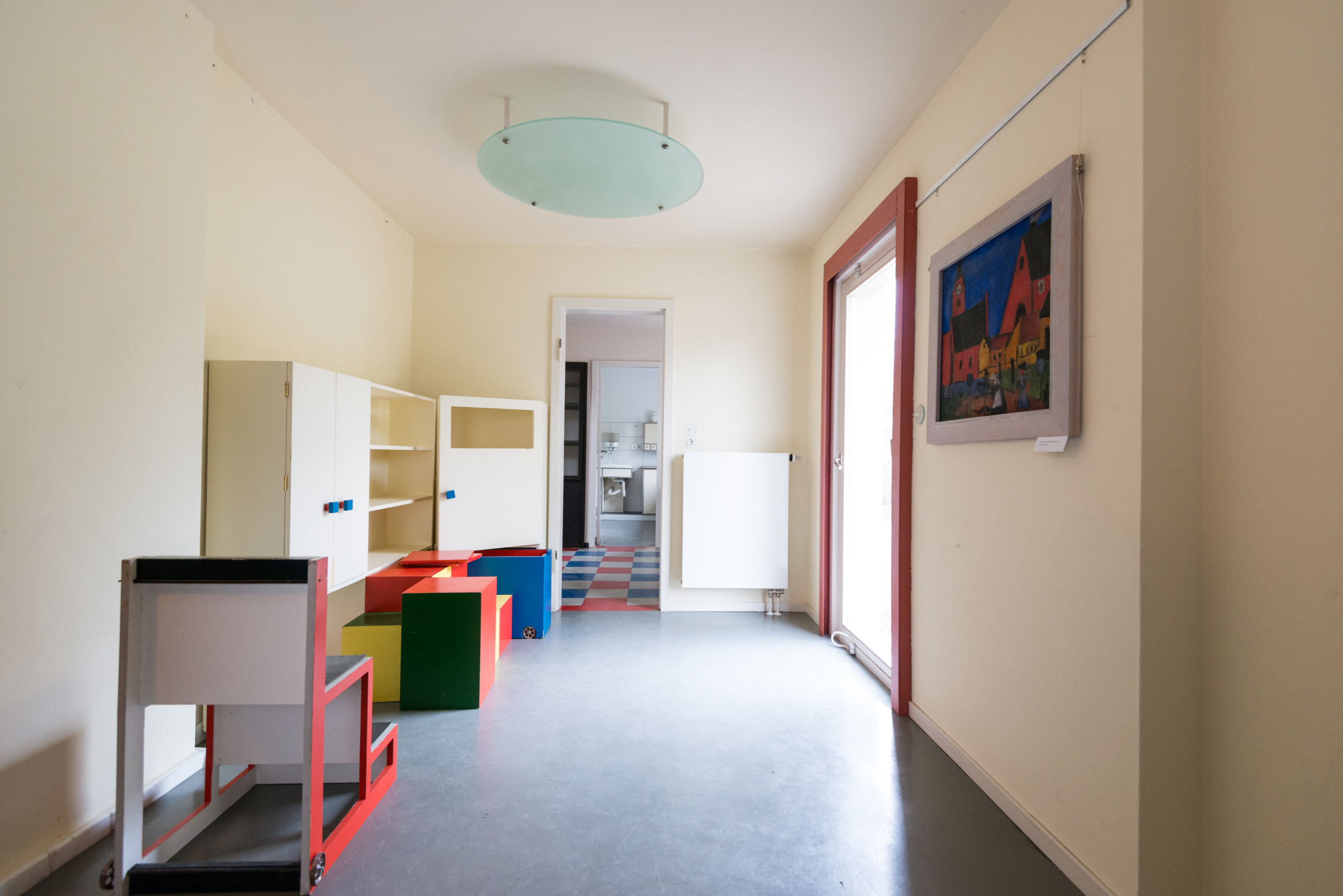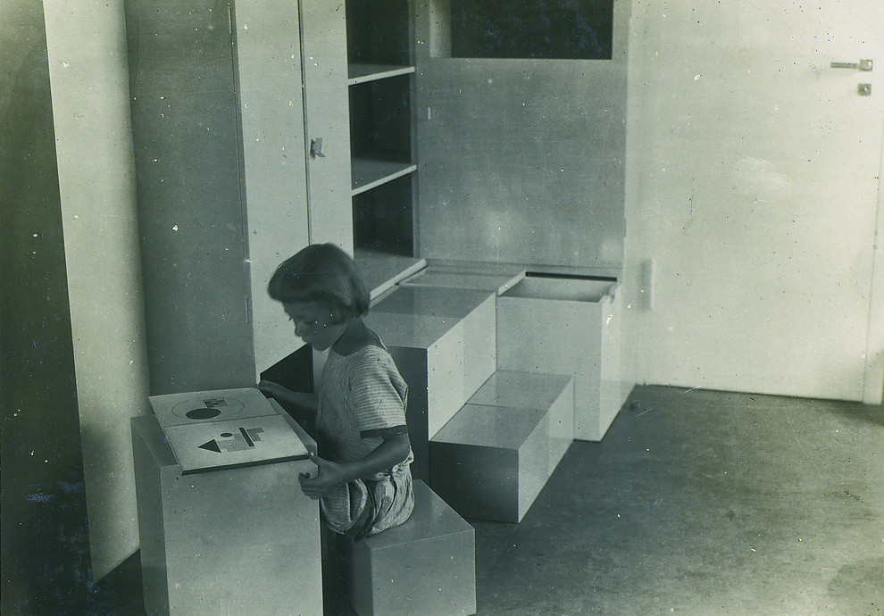 Das Kinderzimmer wurde als erste polyfunktionale Spiellandschaft der Welt eingerichtet. Entworfen hatte sie eine Schülerin der Holzbildhauerwerkstatt, Alma Buscher. Auch die Deckenlampe stammt von ihr. Sie war als kinematografischer Aparat gedacht und sollte ursprünglich per Kurbel heruntergelassen werden können, so dass Kinder Scherenschnitte und dergleichen darauf hätten legen können. „Bedenken Sie, dass Moholy-Nagy seinen berühmten Licht-Raum-Modulator kurz darauf erfand“, sagt Siebenbrodt mit einem Augenzwinkern. „Er wird vielleicht durch die Werkstätten gegangen sein und sich von Buschers Lampe inspiriert haben lassen.“