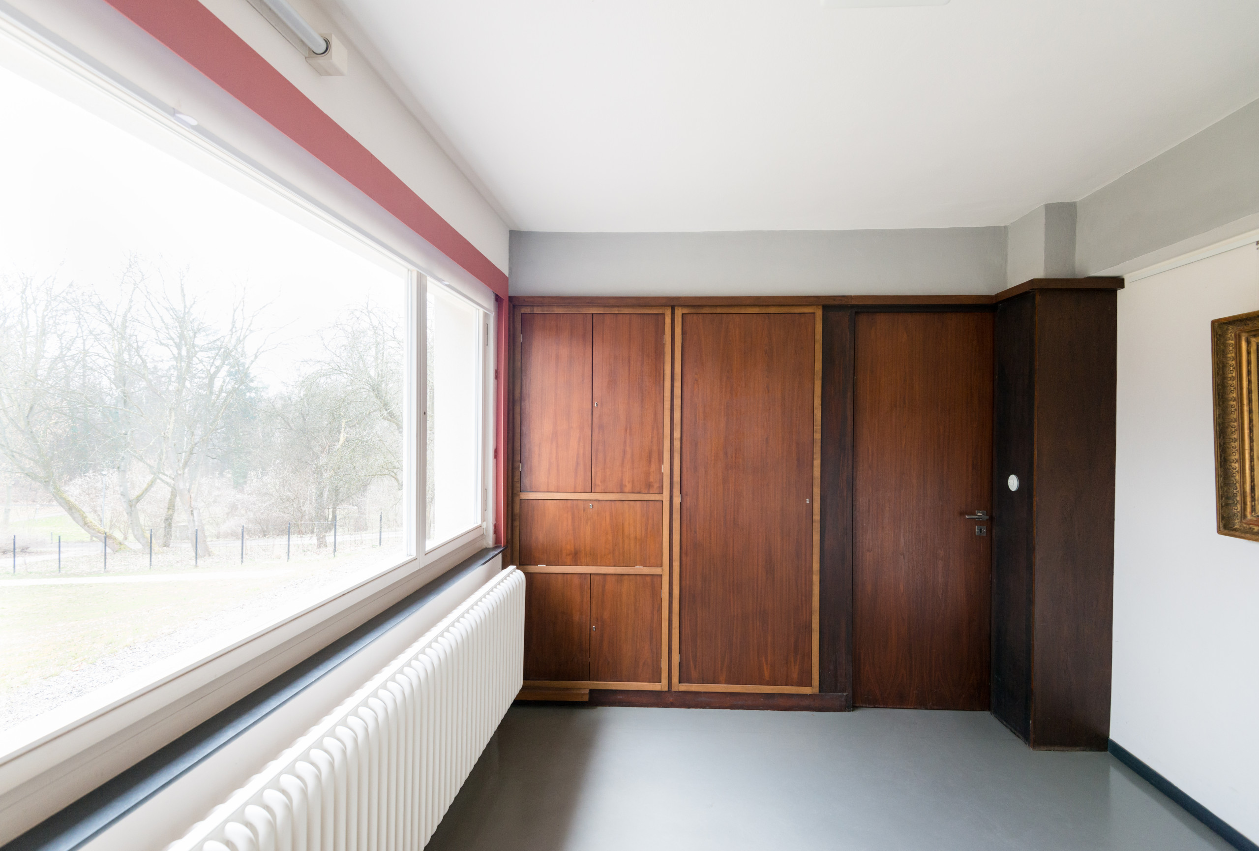 Hier befinden wir uns im „Zimmer der Dame“, das Marcel Breuer gestaltete, der damals noch Student war. Diese von ihm entworfenen Einbauschränke sind im Original erhalten geblieben und wurden während der Generalsanierung 1998-99 aufgearbeitet. Die verschiedenen Elemente der Konstruktion sind, je nach Funktion, rot, goldgelb oder schwarz lasiert.