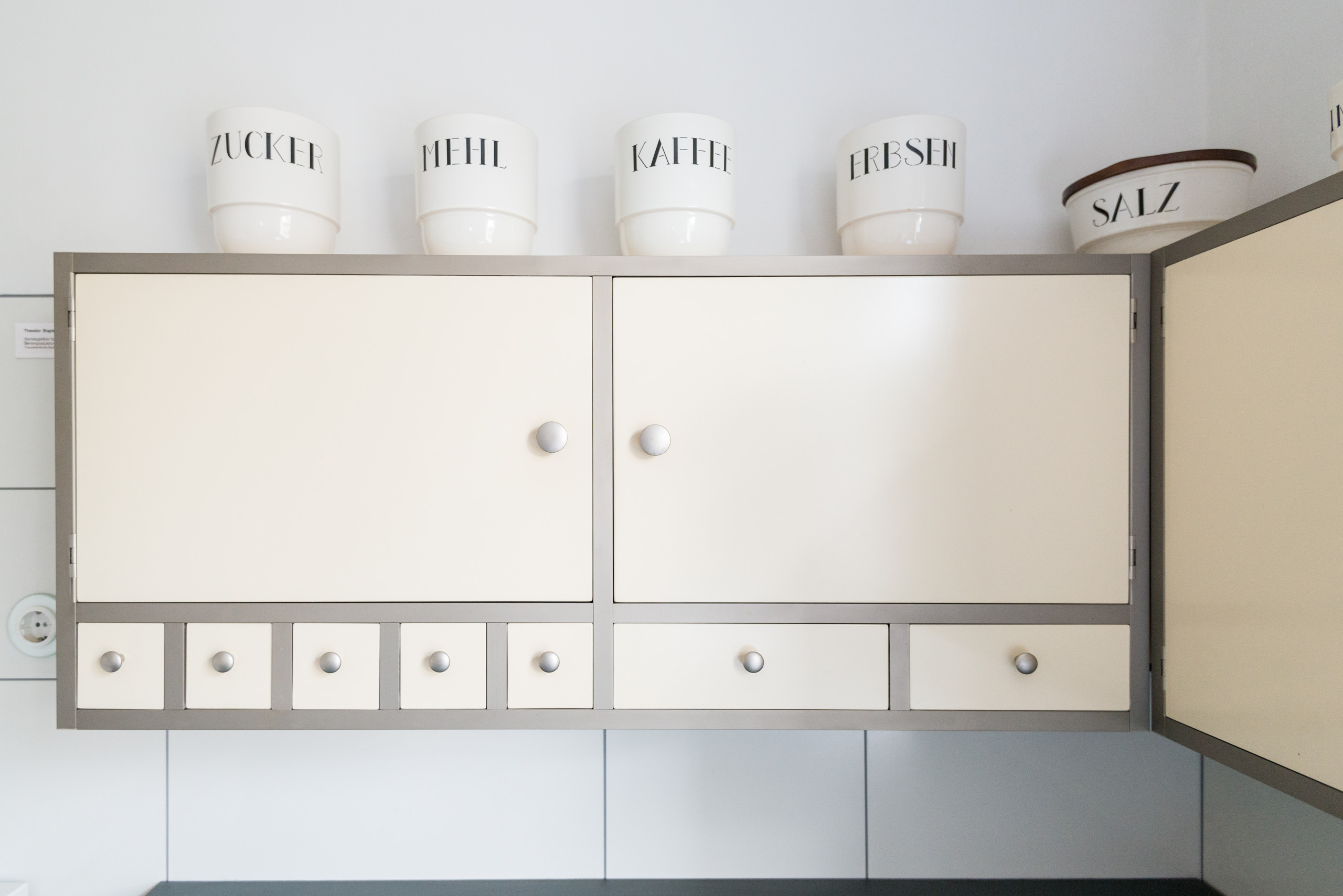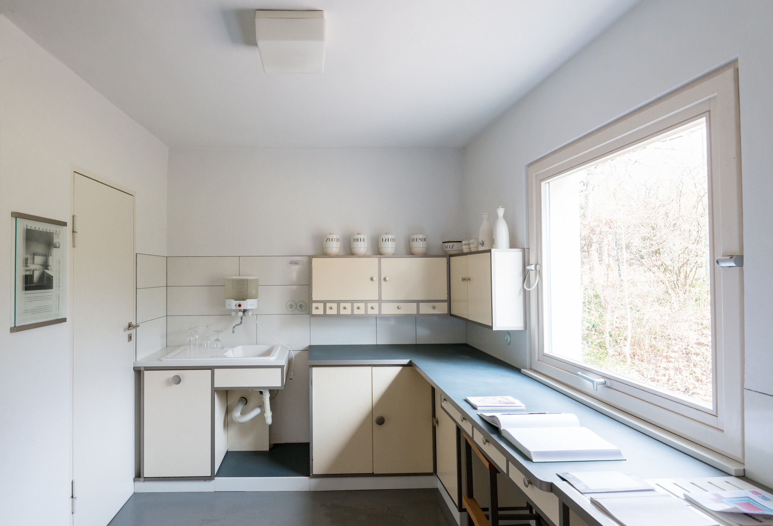 Die Einbauküche entwarf Benita Otte. Hier sehen wir eine Rekonstruktion nach historischen Fotografien. Man beachte, dass diese Küche drei Jahre vor der berühmten „Frankfurter Küche“ entstand, die Margarete Schütte-Lihotzky 1926 entwarf und die heute als Prototyp moderner Einbauküchen gilt. Es ist durchaus möglich, dass Schütte-Lihotzky diese Küche vorher besichtigt hat oder dass ihr zumindest Bilder davon vorlagen. Der Bund Deutscher Architekten verlegte seine Jahrestagung 1923 nach Weimar, wodurch ein breites Fachpublikum das „Haus Am Horn“ besichtigte. Außerdem ging der Büropartner von Gropius und Bauleiter des Hauses, Adolf Meyer, später zu Ernst May nach Frankfurt, wo er am Neuen Frankfurt mitarbeitete.