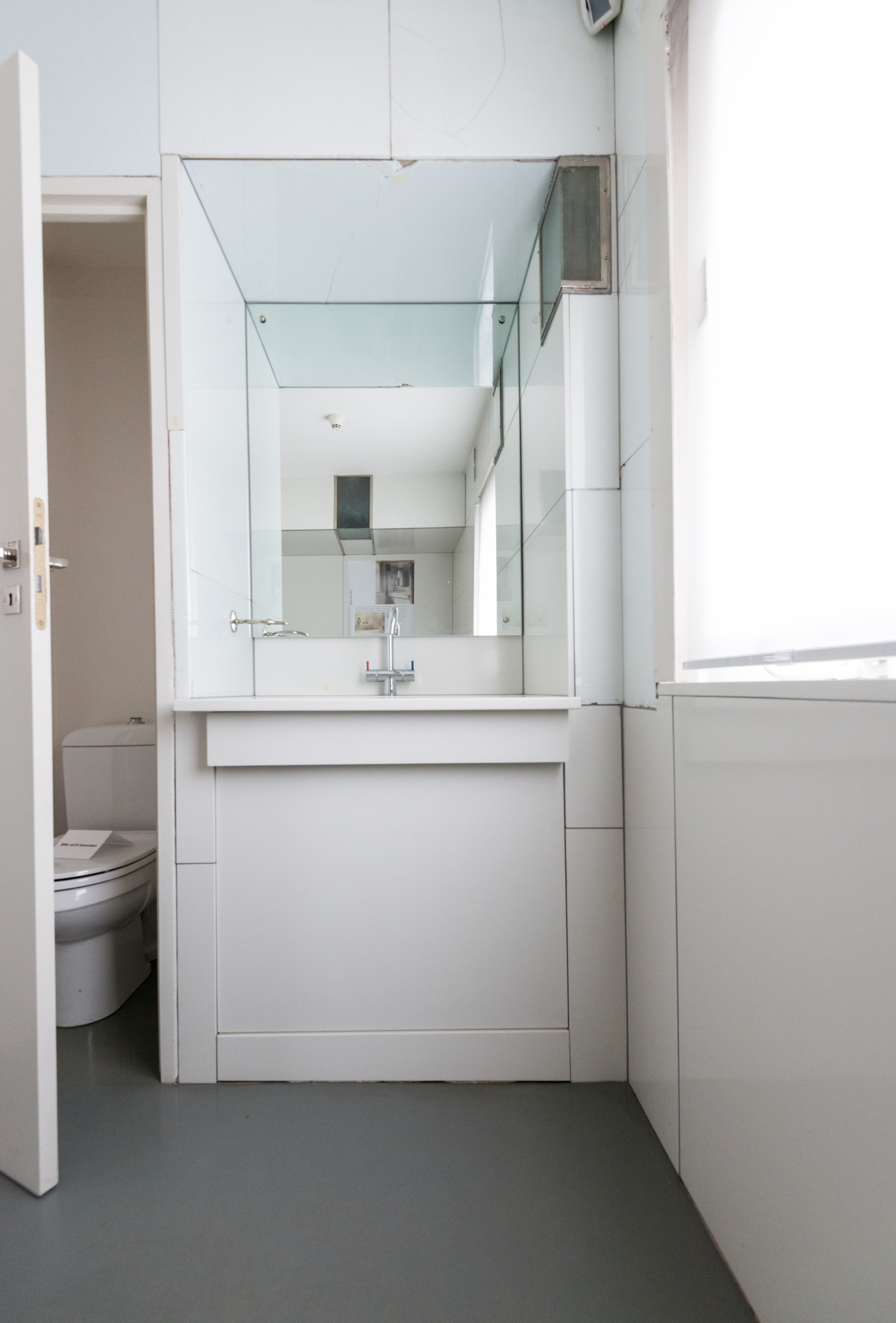 Mit durchgefärbten großformatigen Glastafeln wurde das Bad fugenlos ausgekleidet. Das setzte neue ästhetische und auch hygienische Standards, die bis heute gelten. In der Rekonstruktion wurde das fehlerhaft, nämlich mit dunklen Fugen, nachempfunden.