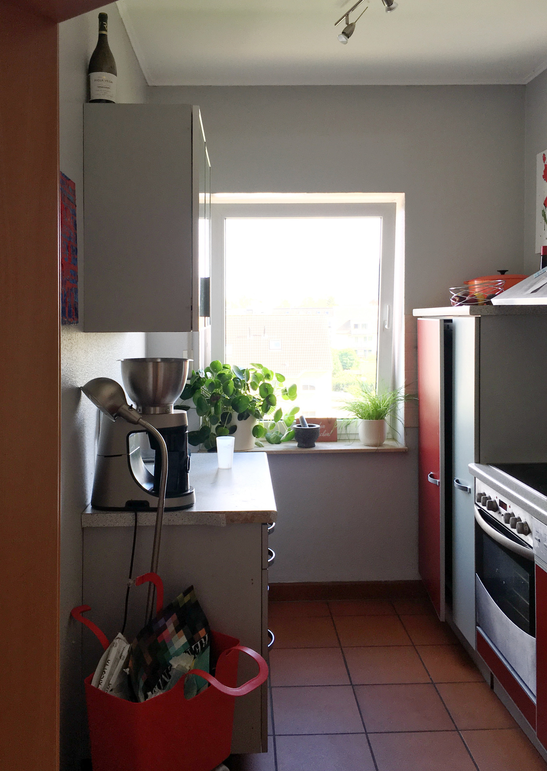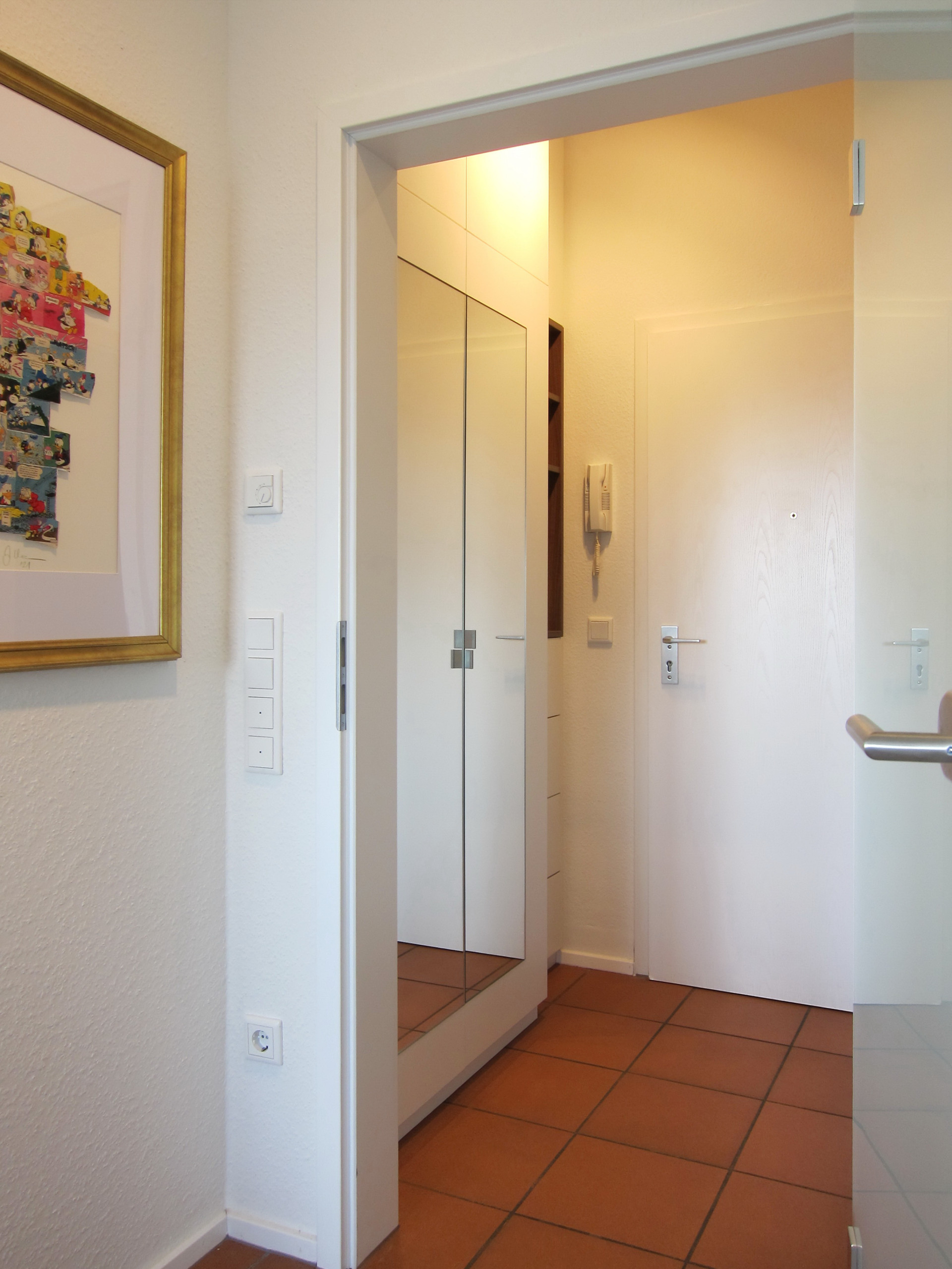 Der Eingangsbereich blieb bis auf den großen Einbauschrank – Stichwort Stauraum – unberührt. Durch die großzügigen Spiegelfronten wirkt der kleine Flur weniger eng. Der Zugang zum Stromkasten ist durch ein offenes Regal, das auch als Schlüsselablage dient, gewährleistet. Bei dem angrenzenden Badezimmer blieb alles beim Alten – vorerst.