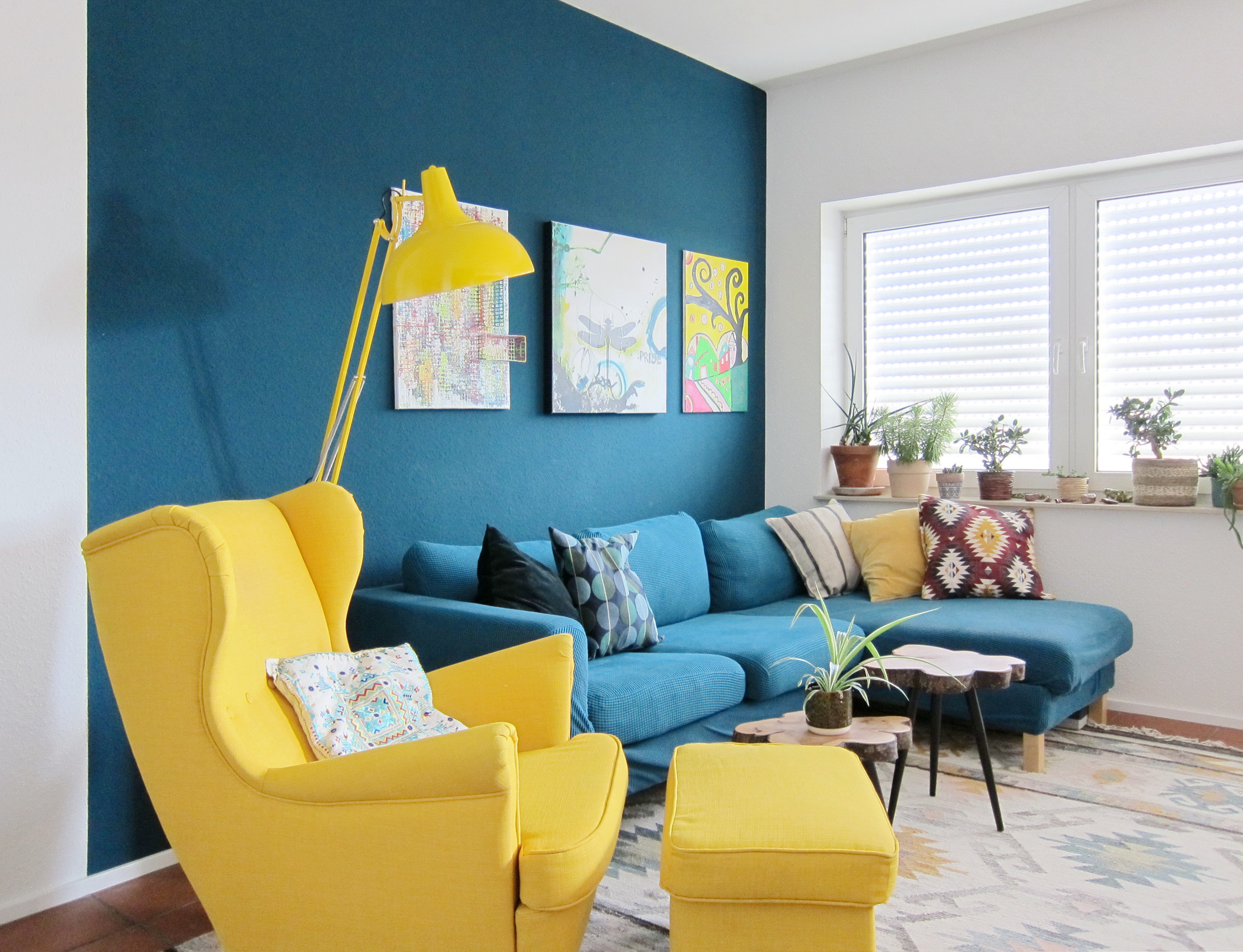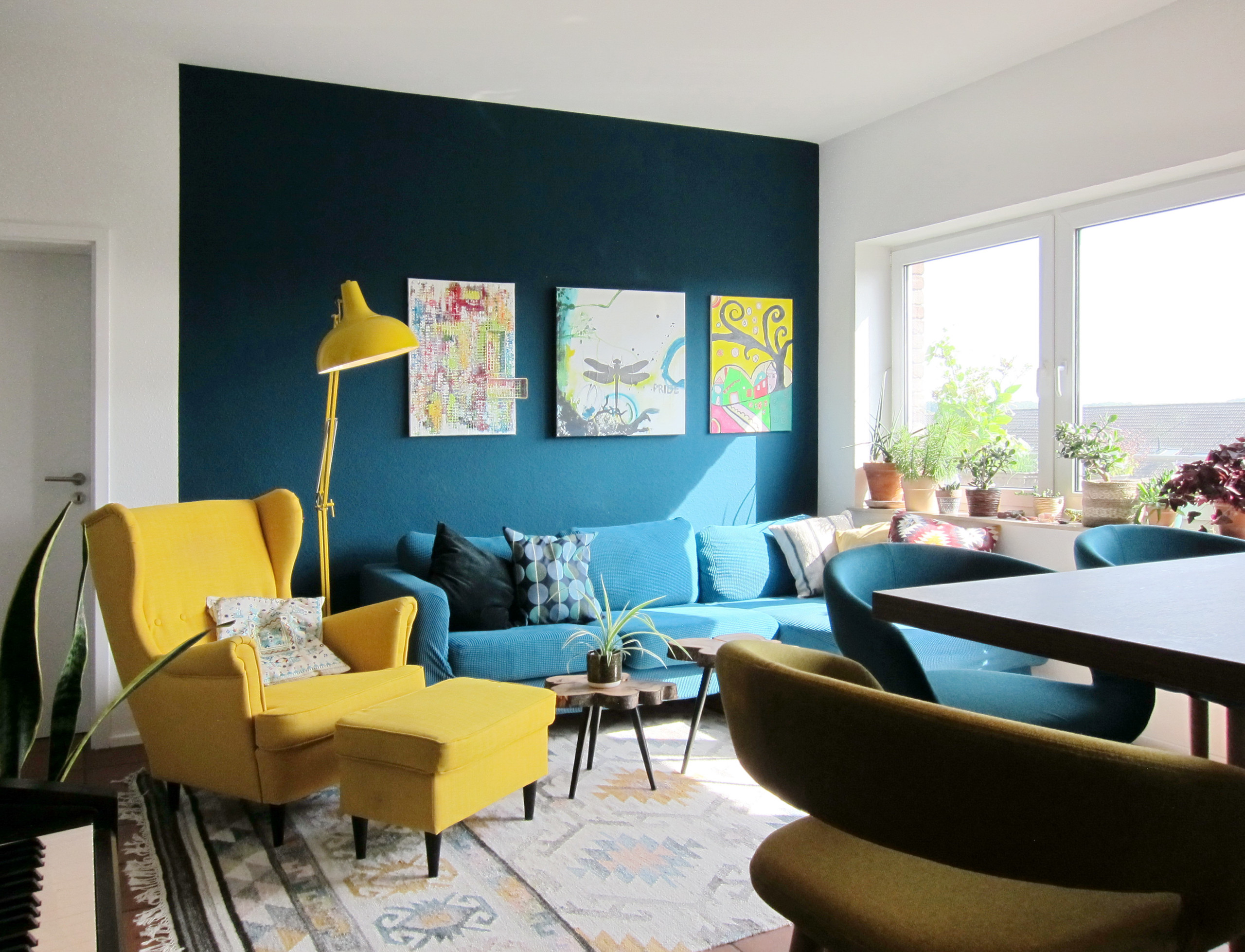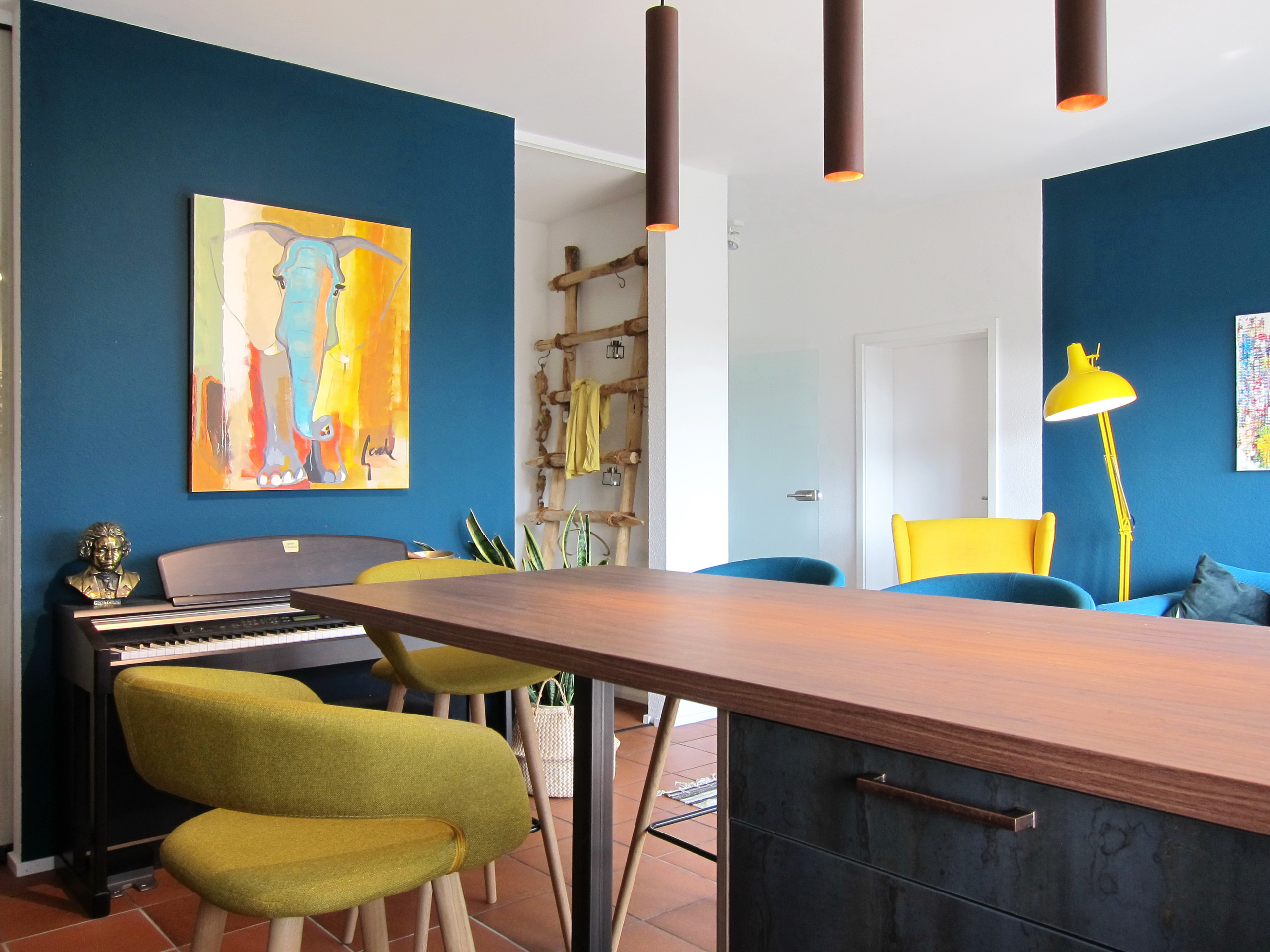 Die Expertin bestärkte ihren Kunden darin, auch in diesem Fall mit kräftigen Farben arbeiten zu können und so ein Gegengewicht zu dem sonst so dominanten Boden zu erlangen. Mit diesem Ansatz entsteht ein moderner Essbereich an der offenen Theke. So ziehen satte Petroltöne und ein Currygelb, das auf den Fotos etwas anders wirkt, in das Zuhause im dritten Stock in Köln ein.