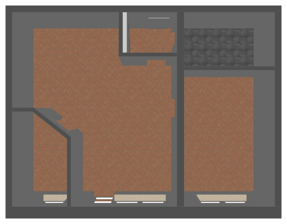 Vorher. Der Original-Grundriss zeigt in der Ecke unten links eine kleine abgeteilte Küche. Bei dem großen Mittelraum handelt es sich um das Wohnzimmer, in das von oben in der Abbildung ein kleiner Eingangsbereich führt. Rechts unten befindet sich das bis dahin einzige und daher gemeinsam genutzte Schlafzimmer mit angrenzendem Badezimmer.