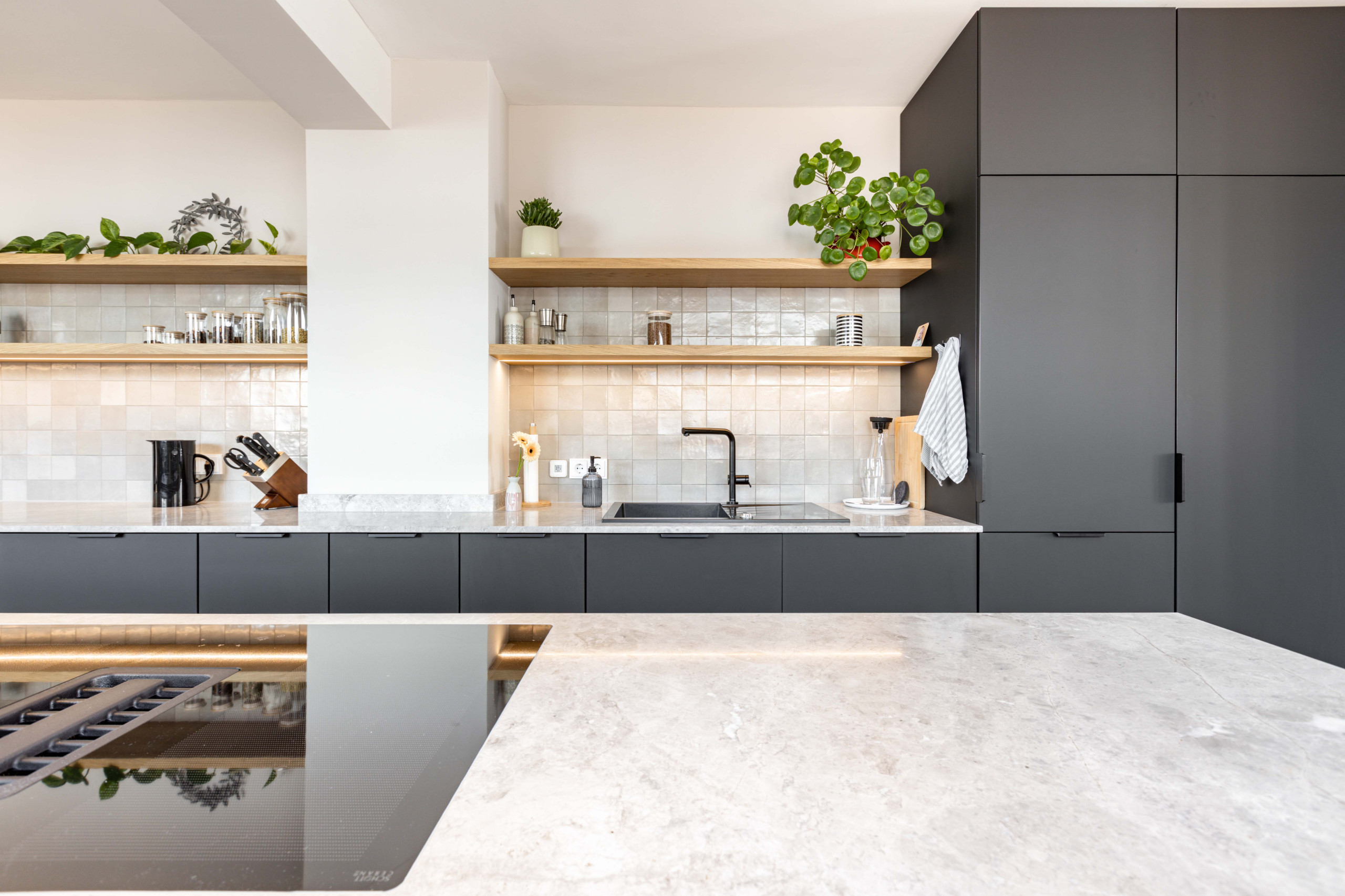 In Kombination mit den Eichenholz-Fronten entsteht eine Balance aus natürlichen Akzenten und urbaner Eleganz. Offene Küchenregale beleben die ruhigen Flächen.