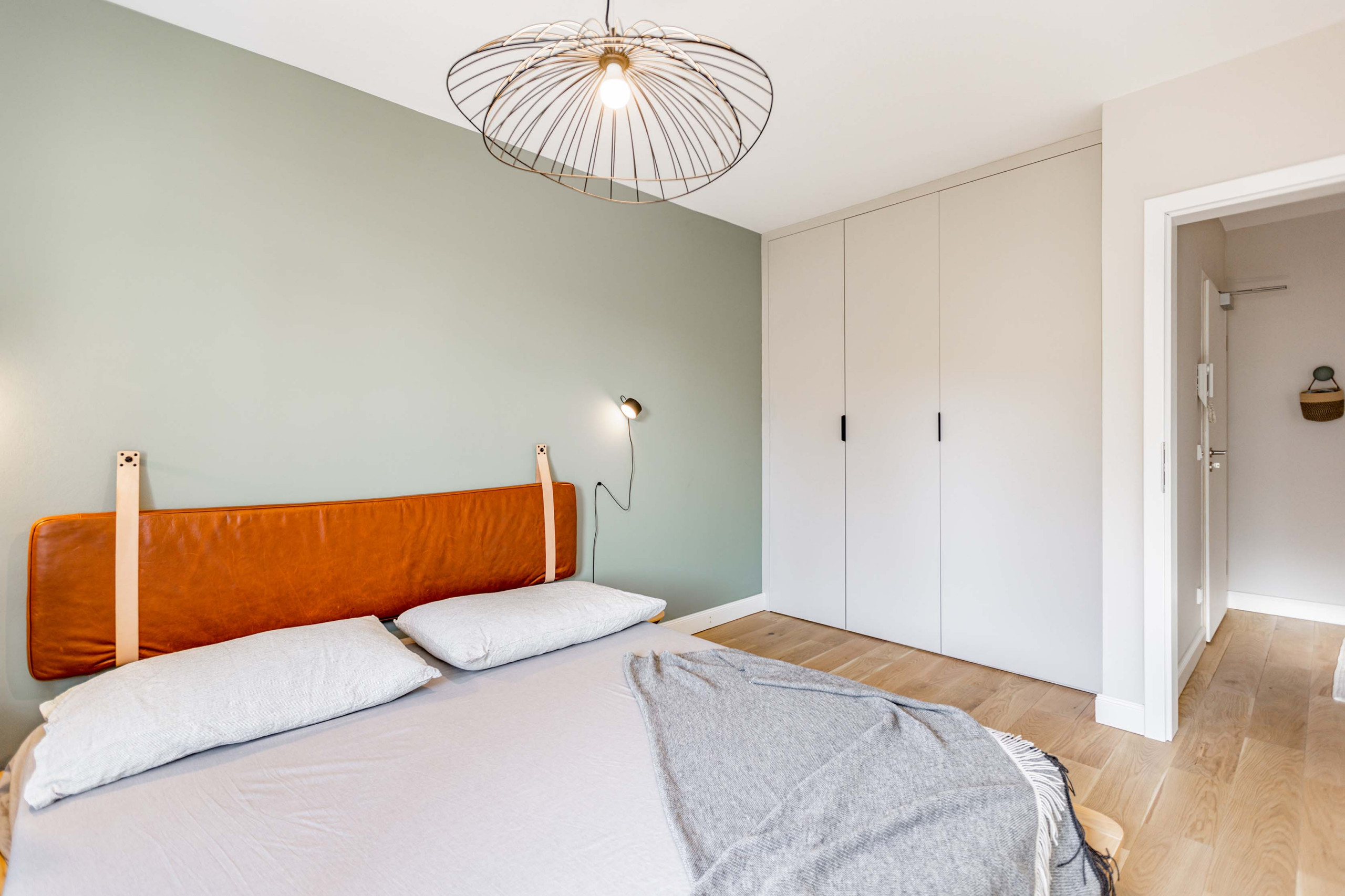 Schlafzimmer. Eine Wand im Elternschlafzimmer ist in dem vertrauten Grünton gestrichen, der die zusammengelegten Wohnungen zusätzlich zu einer Einheit verschmelzen lässt. Wo früher die Abstellkammer war, ist nun ein geräumiger Einbauschrank. „Das Kopfteil des Bettes sollte ein Hingucker werden“, so die Expertin. Das Leder greift das Material der Stühle und des Sofas im Wohnbereich auf. Mit Abschluss der Bauarbeiten erfüllte sich auch der Kinderwunsch des Paares, sodass die dreiköpfige Familie nun rundum glücklich ihr neues Zuhause genießen kann.