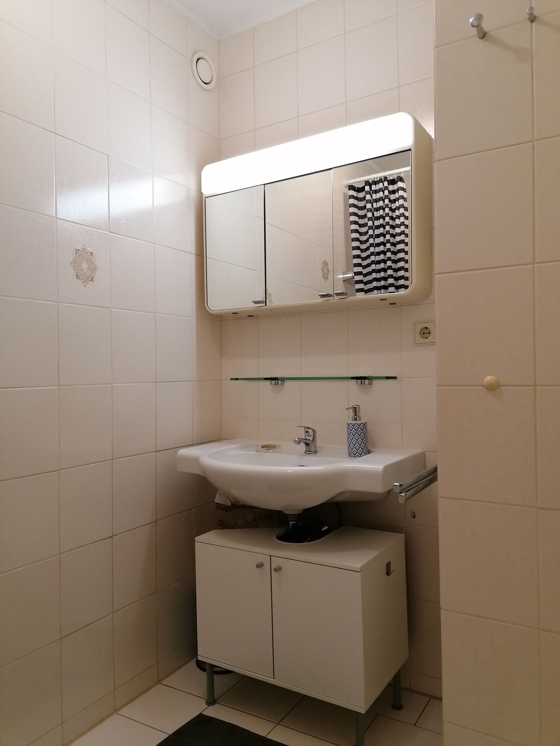 Badezimmer. Das private Badezimmer der Familie verfügt über eine großzügige Regendusche. Sie ist leicht erhöht durch einen Sockel.