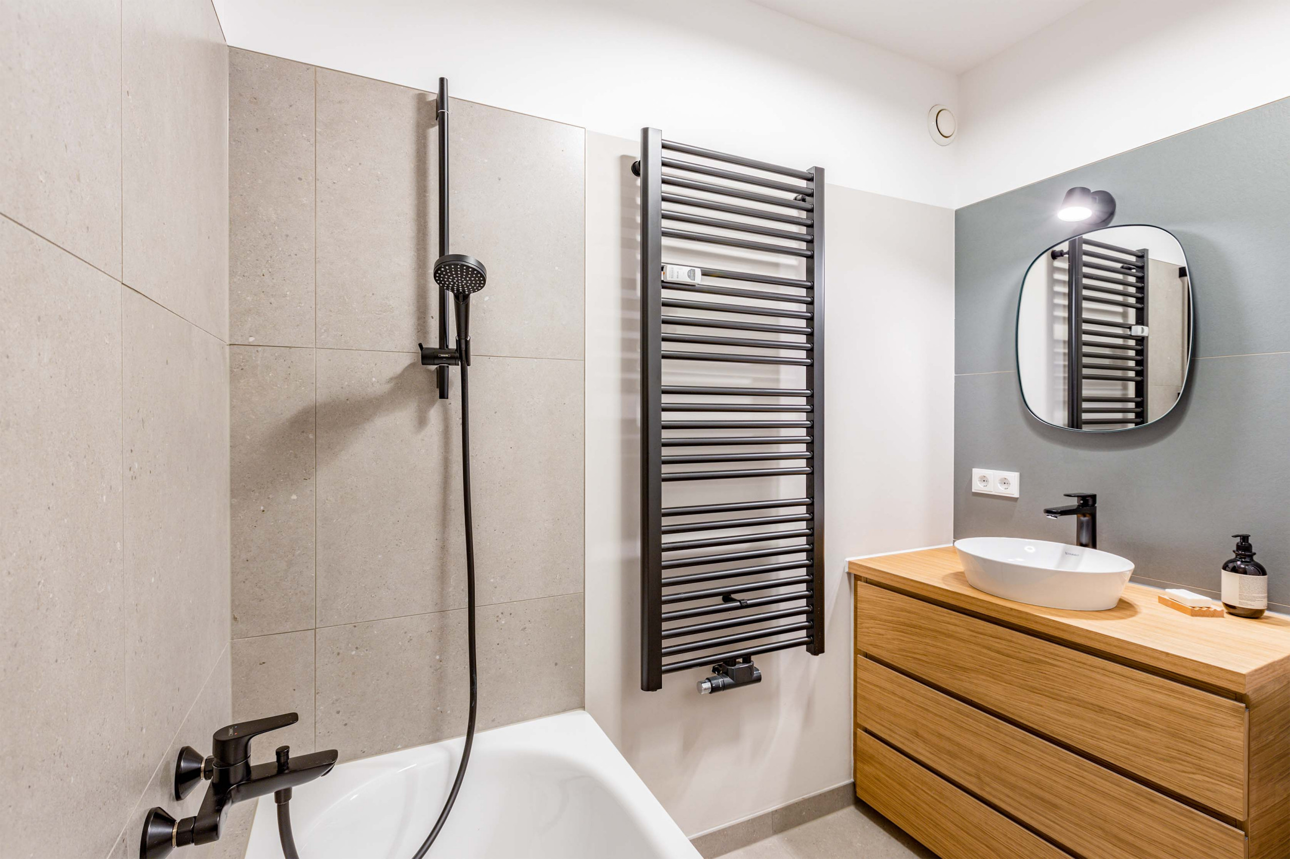 Gästebad. Das frühere Badezimmer ist nun hauptsächlich für Gäste gedacht. Mit Hinblick auf Nachwuchs wollte das Paar hier die Badewanne beibehalten. Schwarze Armaturen, großformatige Fliesen und maßgefertigte Holzmöbel finden sich als roter Faden in allen, nun insgesamt drei Bädern. Die Wand hinter dem Spiegel weist das Grün-Grau auf, das sich auch in den anderen Räumen als dezente Anspielung auf die Naturverbundenheit wiederfindet.