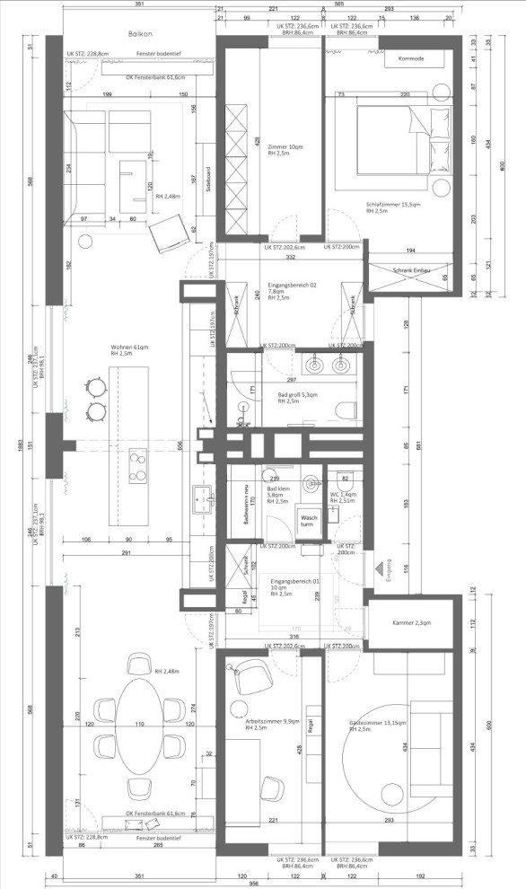 Der Eingang der ersten Wohnung wurde in der Planung zum Haupteingang der zusammengelegten Wohnung. Der Eingang zur ehemaligen Nachbarswohnung blieb trotzdem erhalten. So ist der Hausflur unverändert und die Trennung der Wohnung kann bei Bedarf wieder rückgängig gemacht werden. Vom Eingang (in der Abbildung unten rechts) geht es zunächst in den Flurbereich. Rechts liegen Gäste-WC und Wannenbad und links, neben einer kleinen Kammer, Gäste- und Arbeitszimmer. Von dort aus geht es weiter in den nun besonders großzügig geschnittenen Wohn-, Koch- und Essbereich. Dieser erstreckt sich über die gesamte Länge der Wohnung, mit extra viel Tageslicht und zwei Balkonen. Daran schließt sich der private Bereich mit einem kleinen Flur, dem Kinderzimmer, Elternschlafzimmer und einem großen Duschbad.