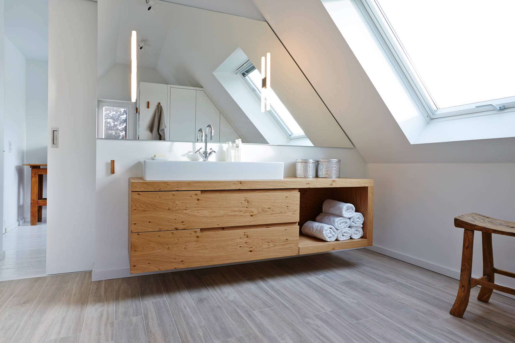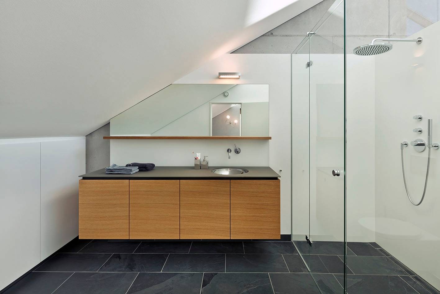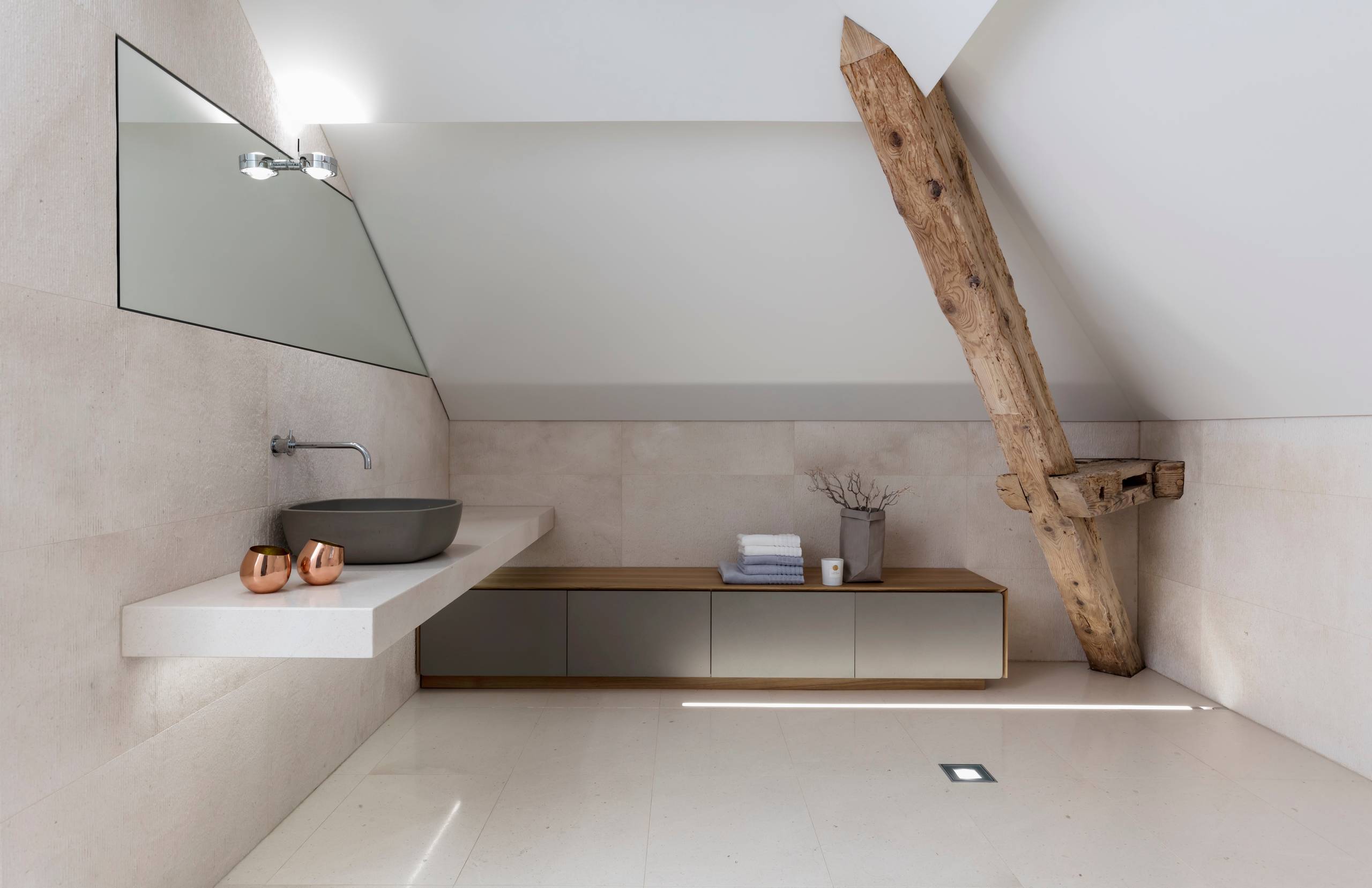 Praktisch sind Waschtische, die mehrere Funktionen vereinen. Im Idealfall haben sie sowohl Ablageflächen als auch geräumige Schubfächer, und hinter den Spiegelflächen finden Stauraum oder zusätzliche Lichtquellen Platz (auch Spiegel mit integrierter Beleuchtung lassen sich genau an Schrägen anpassen). Große Spiegelflächen helfen zudem, kompliziert geschnittene Dachräume großzügiger und heller zu gestalten.