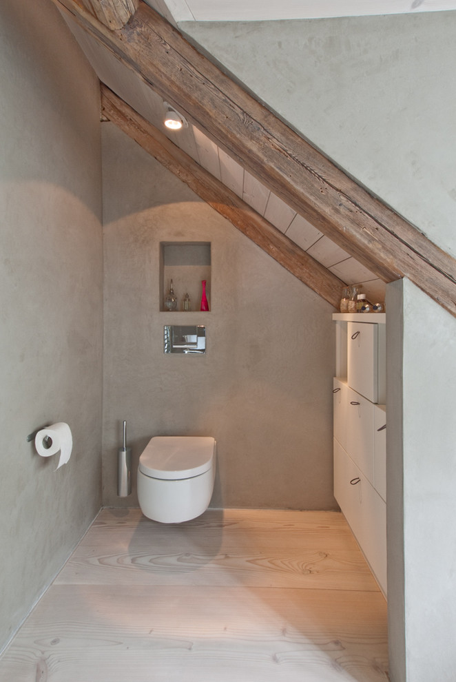 Gestaltet man Decken und schräge Wände im gleichen Farbton, vermittelt dies den Eindruck, die geneigten Wände gehörten zur Deckenfläche. So wirkt das Badezimmer mit Dachschräge ruhiger und größer.