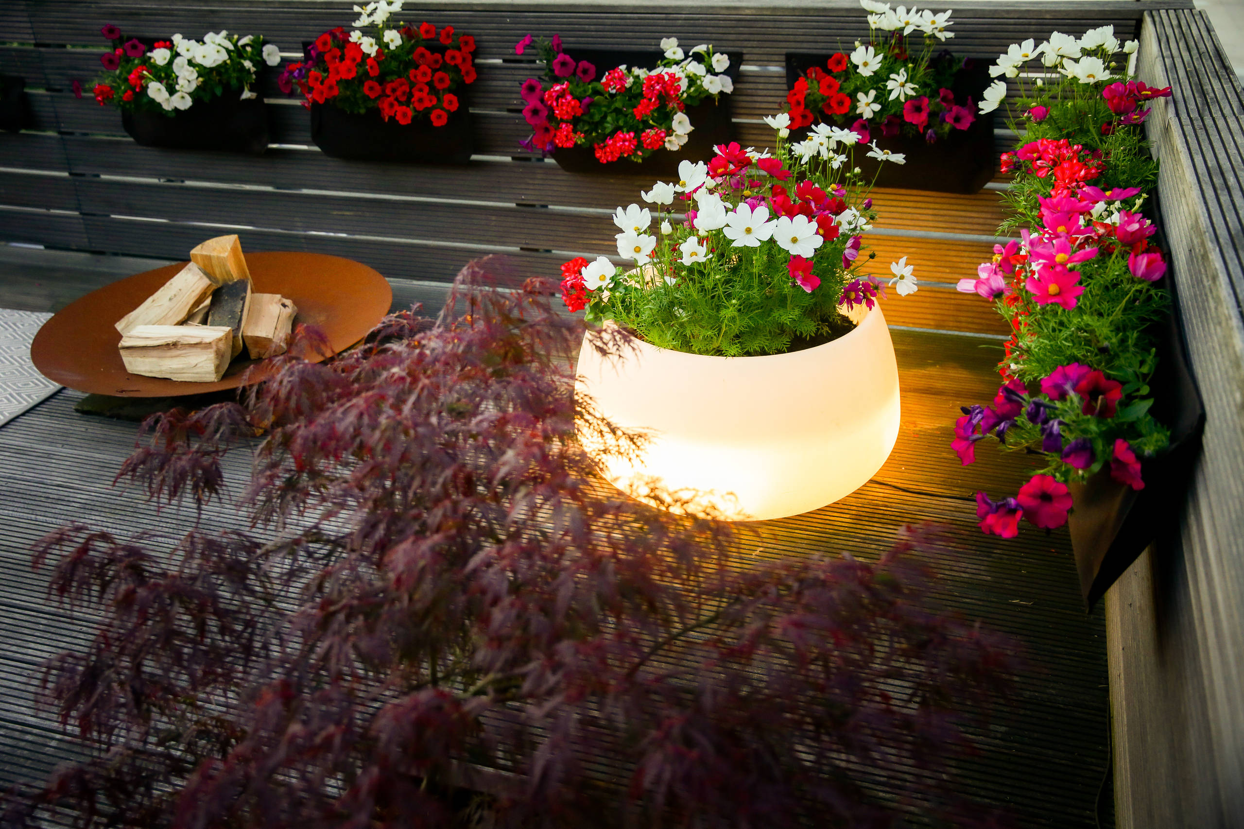 Eine schöne Lichtwirkung auf dem Balkon oder der Terrasse kann man auch mit einer angestrahlten, üppigen Vegetation erzielen. „Blumenkübel oder auch kleine Beete werden etwa durch Bodeneinbau- oder Spießstrahler auf stimmungsvolle Weise inszeniert“, so Yetgin. Um eine Blendung zu vermeiden, sollte die Lichtrichtung immer dieselbe wie die Blickrichtung sein. Ist der Außenbereich klein, reichen auch Leuchten mit Erdspieß, die in den Pflanztopf gesteckt werden ( (und ganz leicht wieder umgesetzt werden können).