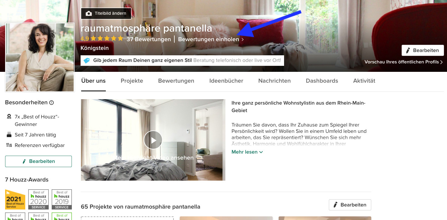 Nur ca. drei Prozent der über 2,5 Millionen aktiven Houzz-Profis gewinnen jedes Jahr einen „Best of Houzz“-Award. In vielen Fällen bedeutet das, dass die Gewinnerfotos tausendfach als Inspiration gespeichert werden, weil sie die Houzz-Community ernsthaft begeistern. Gut zu wissen: Bei den „Best of Houzz - Service“-Badges werden nur Bewertungen von Kund:innen berücksichtigt. Lassen Sie sich diese Chance nicht entgehen und verschicken Sie noch heute eine Bewertungsanfrage und laden Sie Fotos Ihrer Projekte hoch.