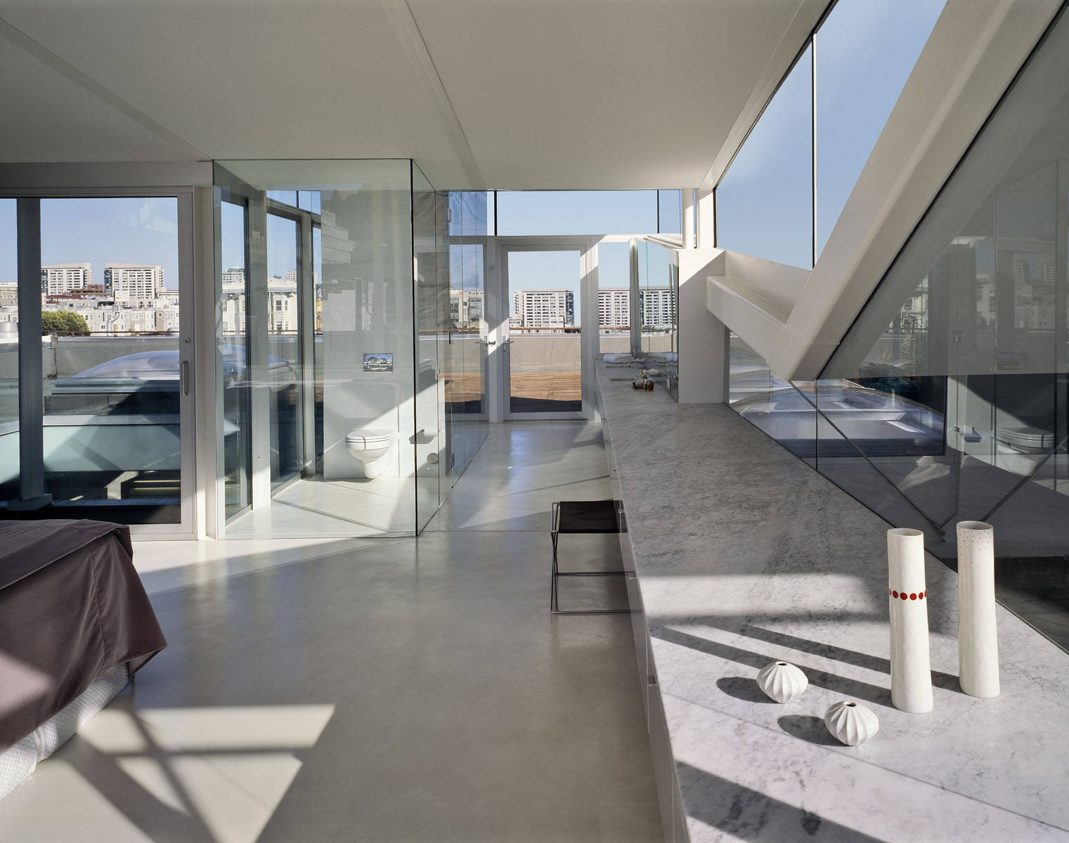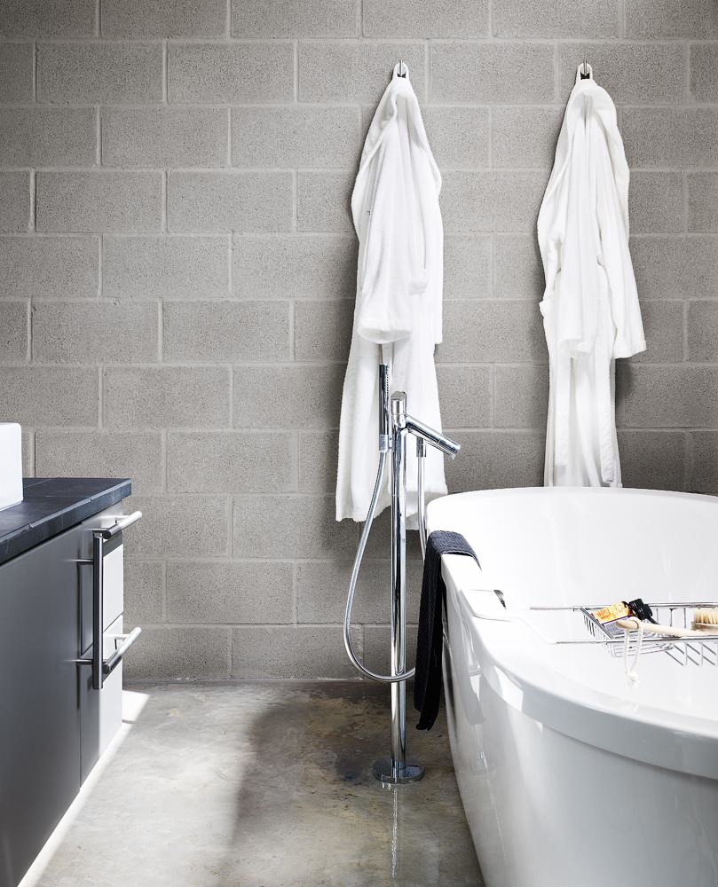 Die Textur dieses Schlafzimmerbodens entstand, indem bei der Mischung natürliche Zuschläge von „Portland-Mix“ in Grau und Weiß zugegeben wurden. Danach wurde der Boden mit einem Diamantschleifer poliert und klar lackiert. Dadurch behält er, ohne viel Pflege zu benötigen, einen frischen Look.