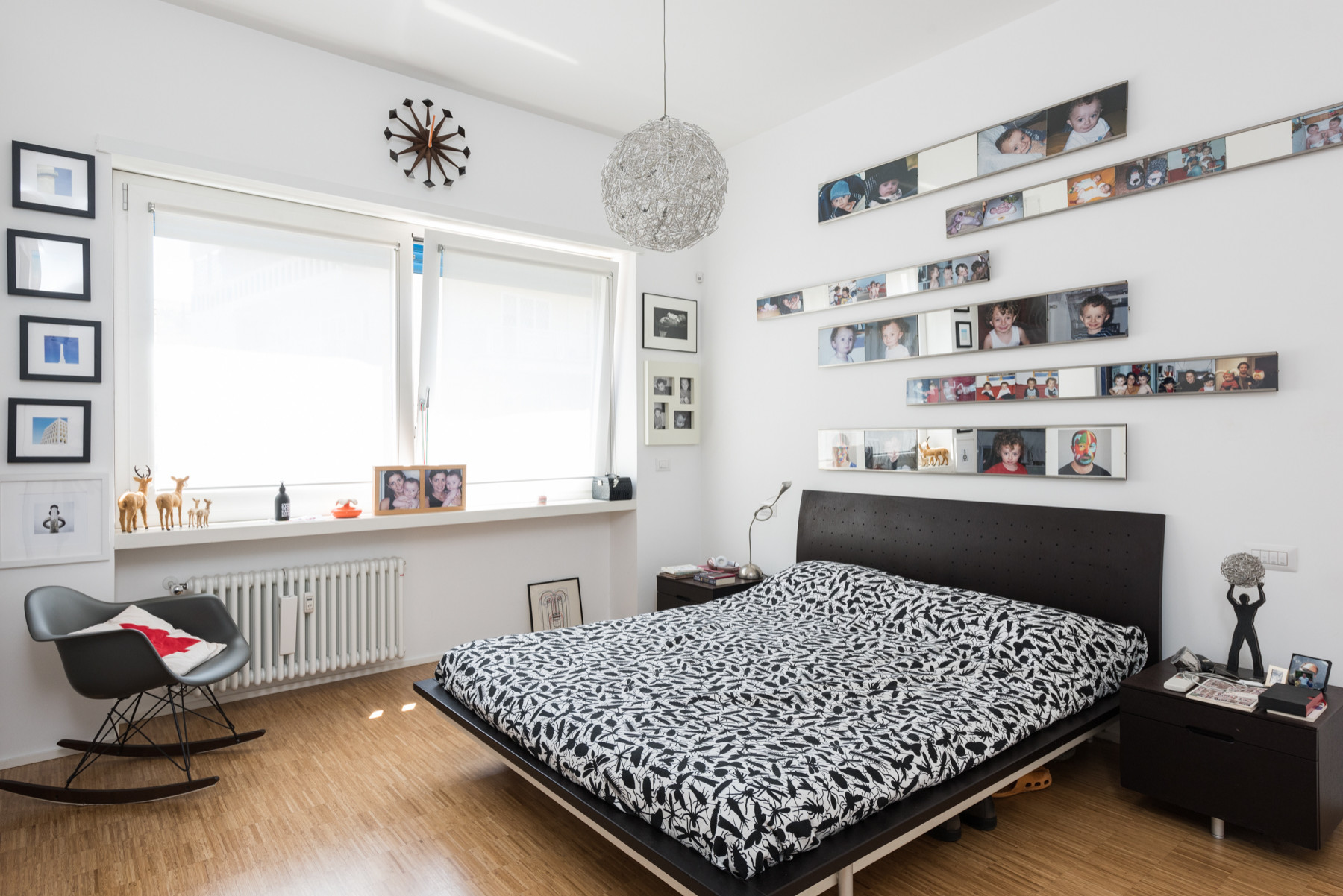 Das Bett zeichnet sich durch sehr klare, saubere Linien aus. Giulio installierte Stahlschienenrahmen über dem Betthaupt. Die Familienfotos bringen Energie in den ansonsten minimalistischen Raum.