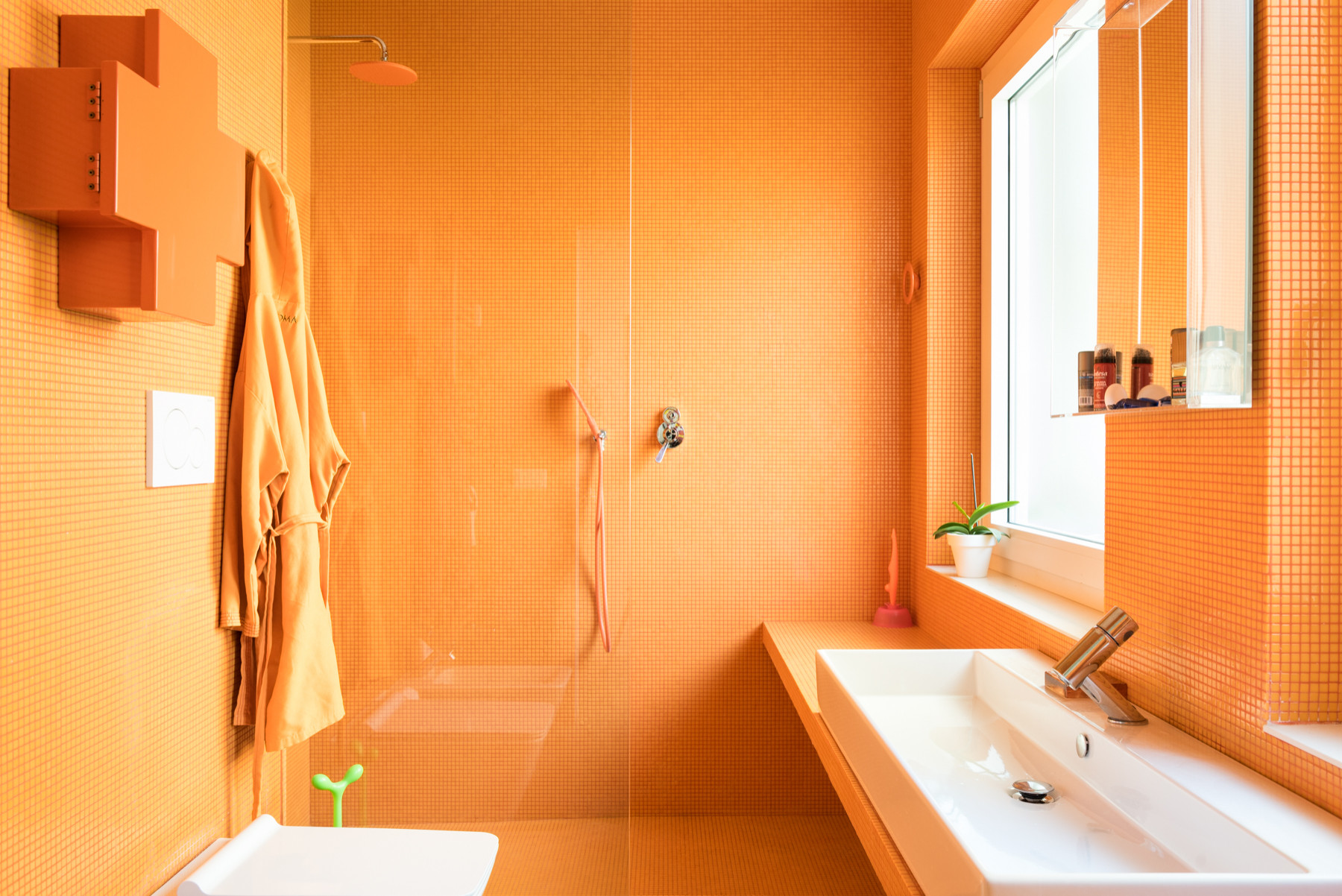 Chiara und Giulio beharrten auf ihrer Vision für die Bäder. Obwohl sie die Wahl zwischen klassischen grauen oder sandfarbenen Fliesen hatten, entschieden sie sich stattdessen für Mini-Mosaik-Glasfliesen in intensivem Orange für das eine Badezimmer und in sattem Blau für das andere.
