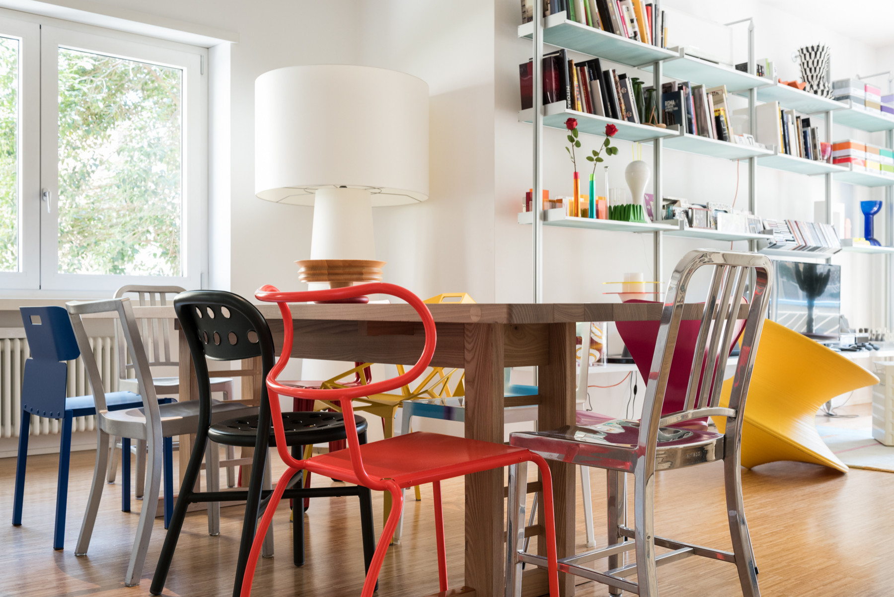 Das Haus ist voll von großen und kleinen Farb- und Designgegenständen, die um die Aufmerksamkeit der Besucher konkurrieren. Der Esstisch ist ein anschauliches Beispiel, umgeben von einem Sammelsurium an unterschiedlichen Stühlen in verschiedenen Farben.
