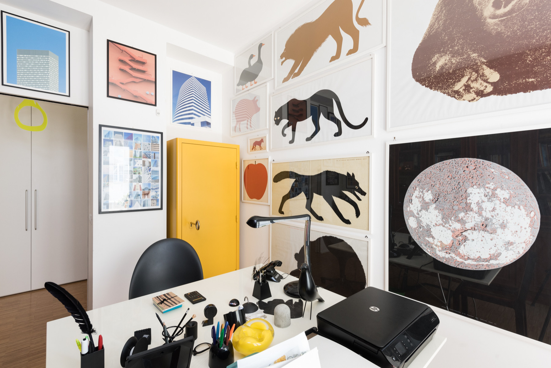 Chiara verbringt viel Zeit im Homeoffice, das voll von Sammelwerken, Designdrucken und Architekturfotografien ihres Mannes ist. Sogar der Schreibtisch ist mit Sammlerstücken bedeckt.
