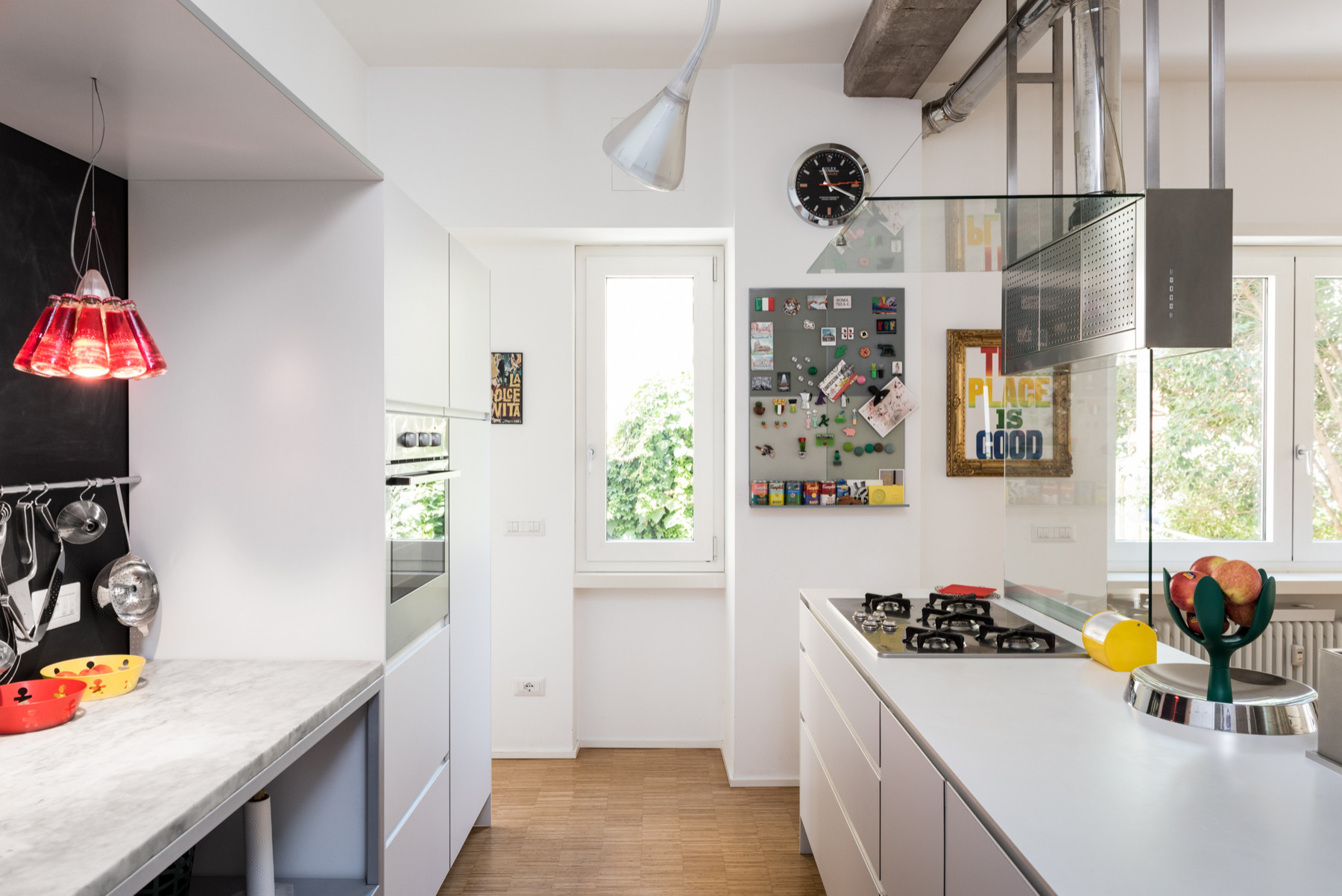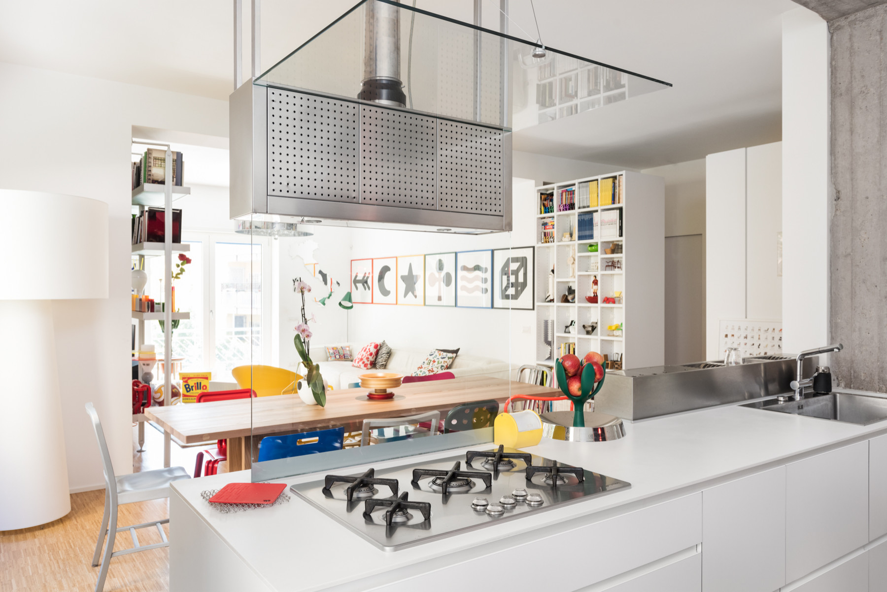 Die Dunstabzugshaube aus Edelstahl, eingerahmt von zwei Scheiben aus gehärtetem Glas, ist ein wichtiges architektonisches Merkmal der Küche. Sie dient als funktionale, aber fast unsichtbare Trennwand zwischen der Kochzone und dem übrigen Raum.