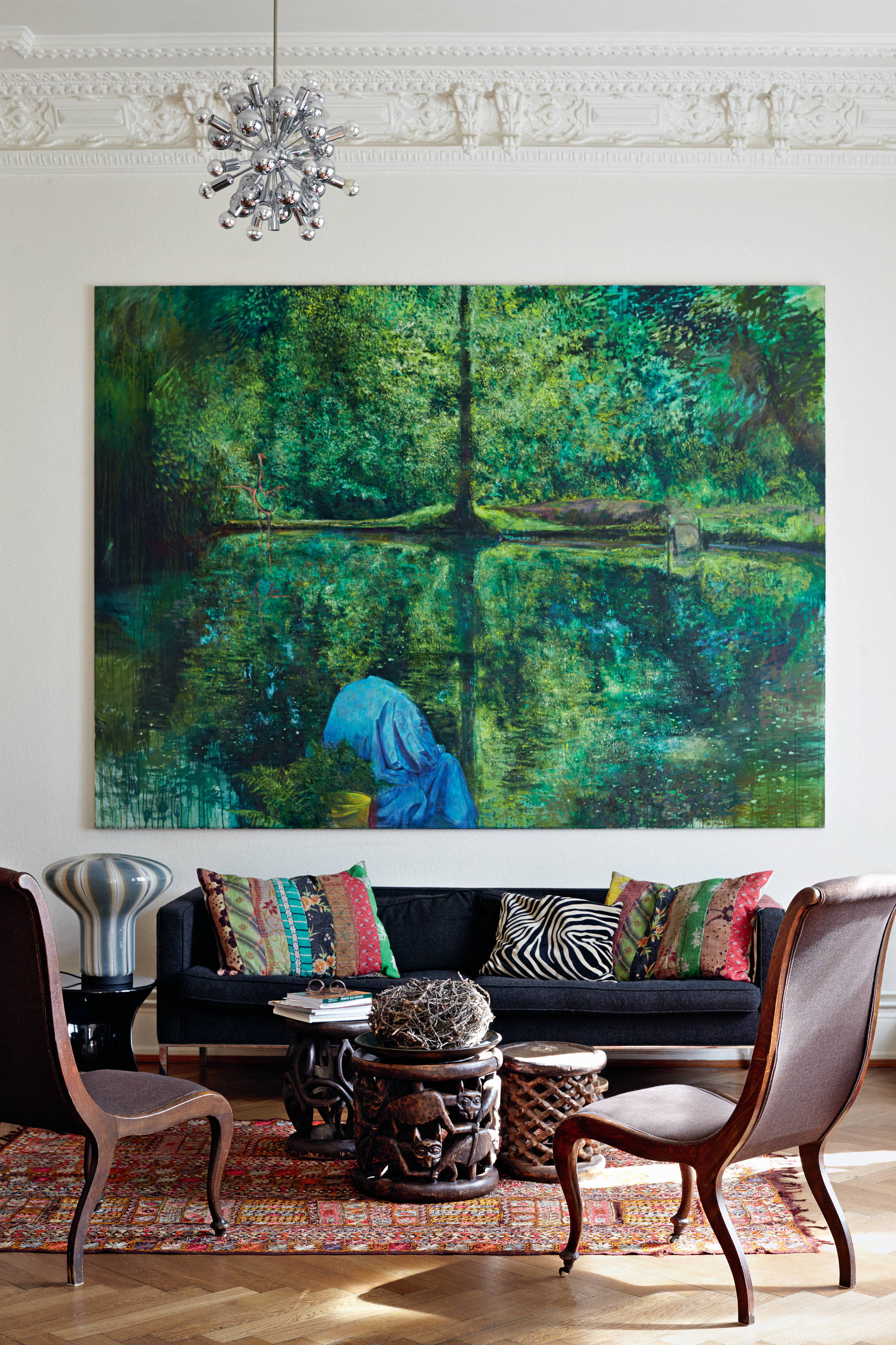 Hier zum Beispiel bietet die Französin Celine Grassmann Einblick in ihre Wohnung, in der sich Stile und Epochen mischen, und Objekte wie türkische Hochzeitsteppiche, afrikanische Hocker und Sari-Kissen aus Indien endlose Geschichten erzählen könnten.
