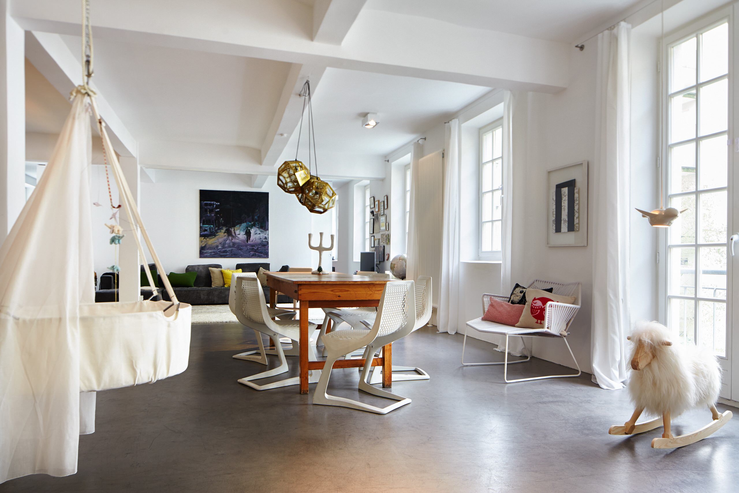Dieses Loft ihrer Freundin Frederike ist wie eine Bühne, die die verschiedenen Bedürfnisse ihrer Bewohner inszeniert: Während Baby Holly in der Hängewiege von Leander schläft, Schwester Pinie auf dem Schaf schaukelt, setzt sich Frederike auf die „Myto“-Freischwinger von Konstantin Grcic für Plank.
