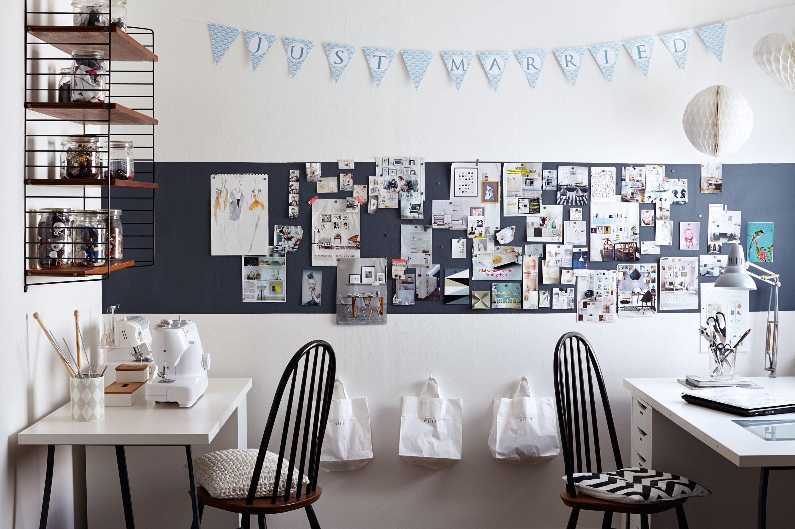 Weiße Wände? Och Nö! Lieber Tapeten, Bilder und Farben – sagen Modedesignerin Karina und ihr Mann Thorsten. Dass eine Tapete nicht zwingend allein an der Wand bleiben muss, sondern gepaart noch interessanter werden kann – mit Regalen, Bildern und Moodboards, zeigt die sympathische Wohnung der beiden.