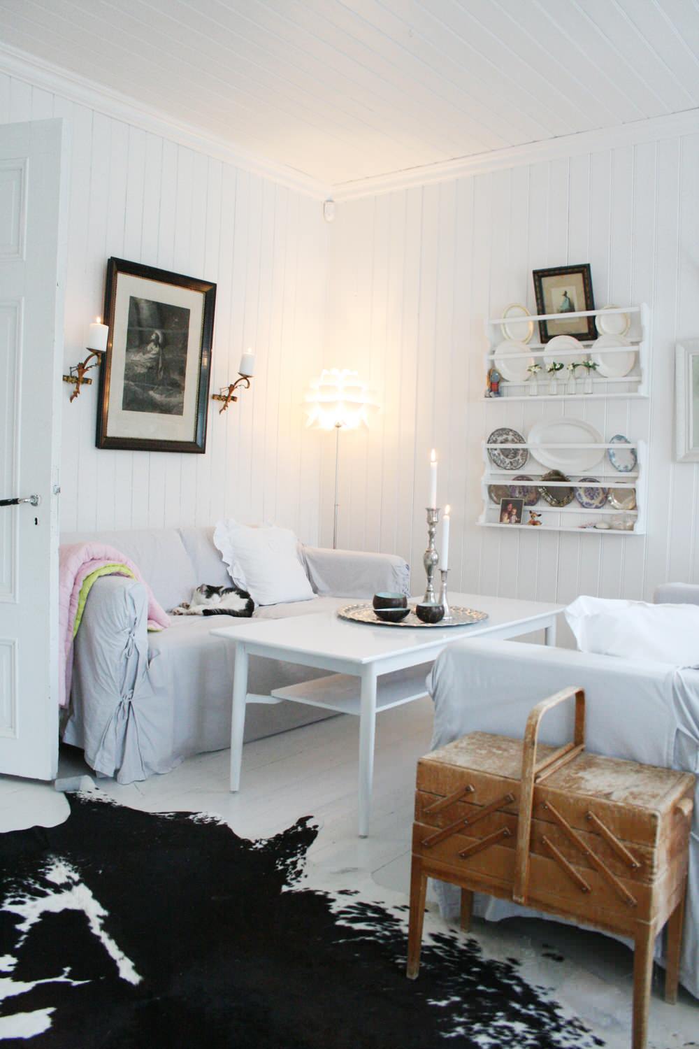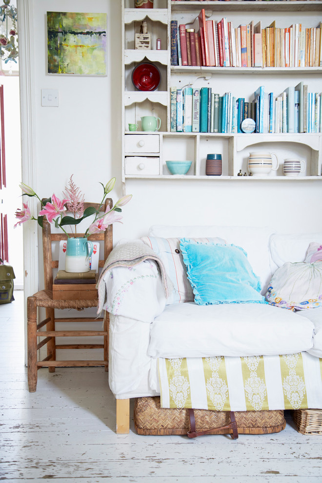 Tipp: Damit sich bei ergonomischen Sitzflächen auf dem Tisch auch Blumenvasen abstellen lassen, hilft ein kleiner Bücherstapel zum Ausgleichen wie in diesem Wohnzimmer im Shabby Chic – mit einem Tablett geht es natürlich auch.