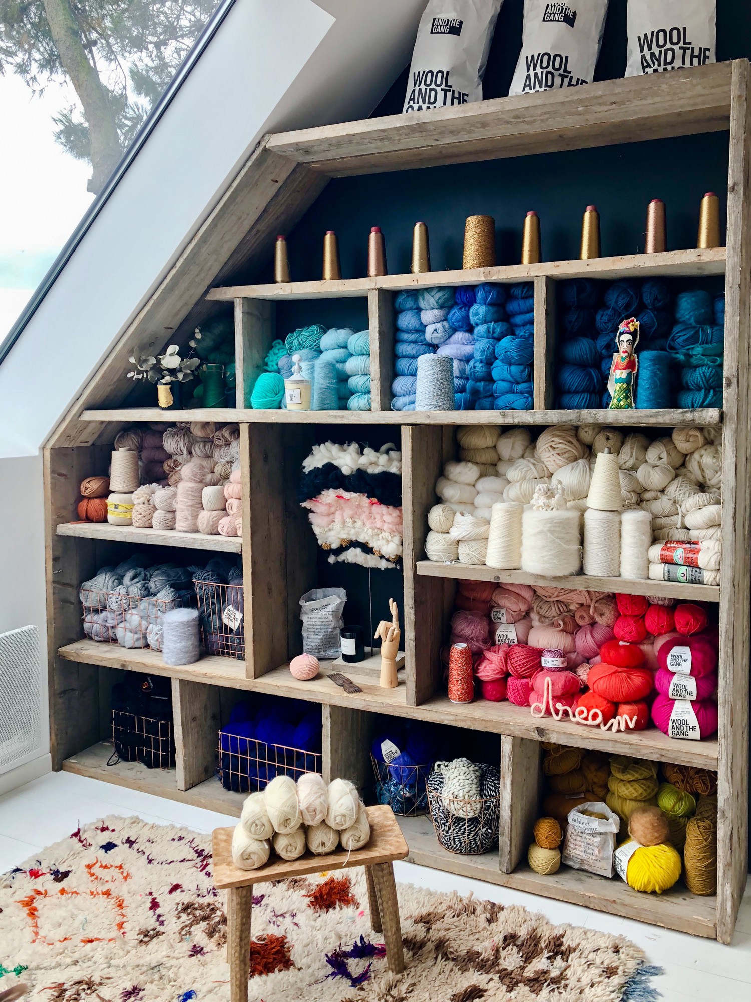 Im Dachgeschoss hat sich Oili ihr lang ersehntes Atelier eingerichtet. Auf einem großen marokkanischen Teppich von Beni M’rirt Moroccan steht ein Marmortisch von Emmaus, einem Netzwerk, das benachteiligten Menschen Arbeit bietet und sich auf das Recycling von Möbeln und anderen Produkten spezialisiert hat.