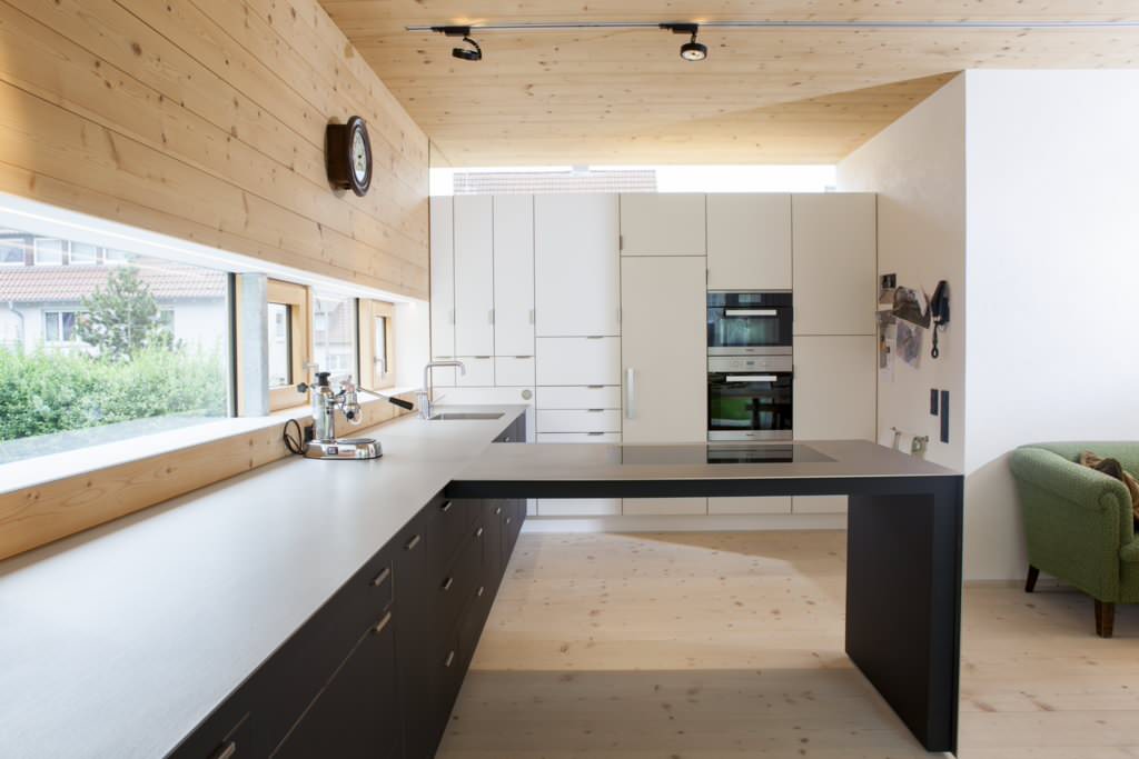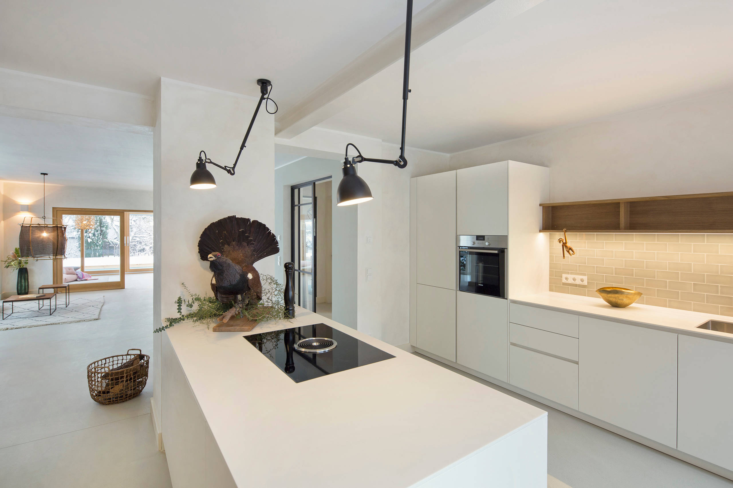 Dezenter geht es kaum. Zwar wird der offene Küchenbereich in diesem Neubau auch durch die Wandbeleuchtung mit Licht versorgt – das Arbeitslicht an der Kücheninsel spenden allerdings zwei Tischleuchten. Denn was der Schreibtischarbeit dienlich ist, erfüllt auch in der Küche seinen Zweck.