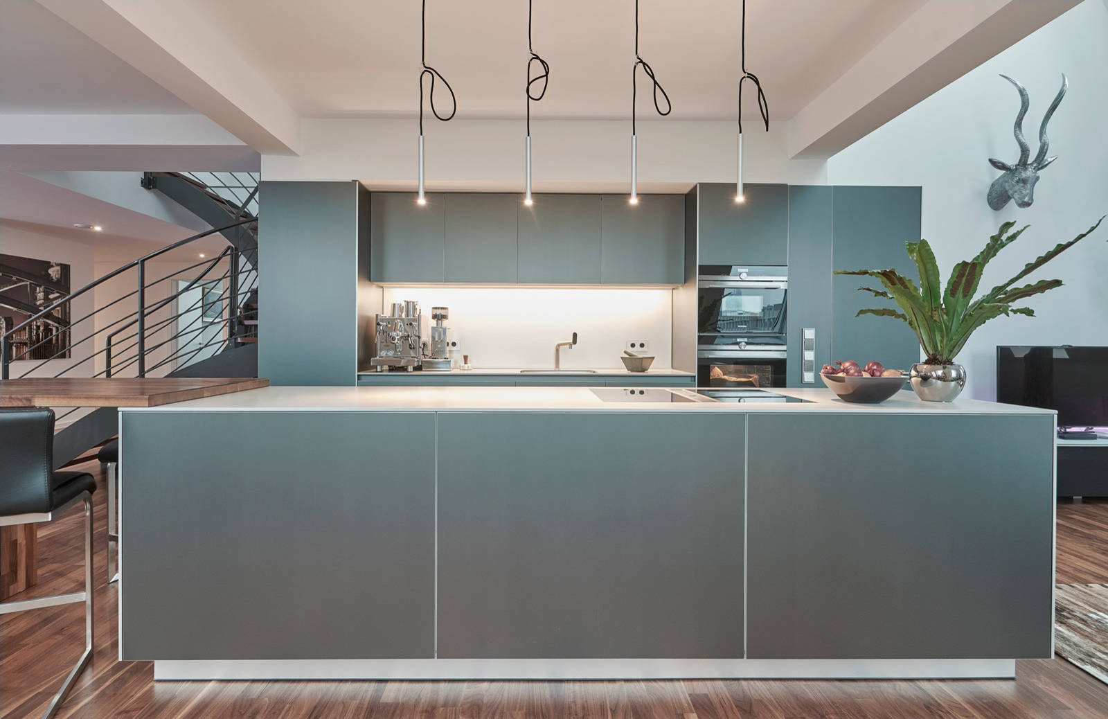 Zum einen lässt sich die klassische Dunstabzugshaube an der Decke nicht mit Pendelleuchten kombinieren. Eine Voraussetzung für diese Variante (und einige der folgenden) ist deshalb eine Dunstabzugslösung, bei der die Kochdünste gleich am Kochfeld nach unten abgesaugt werden, also ein Downdraft-Abzug oder eine Muldenlüftung.