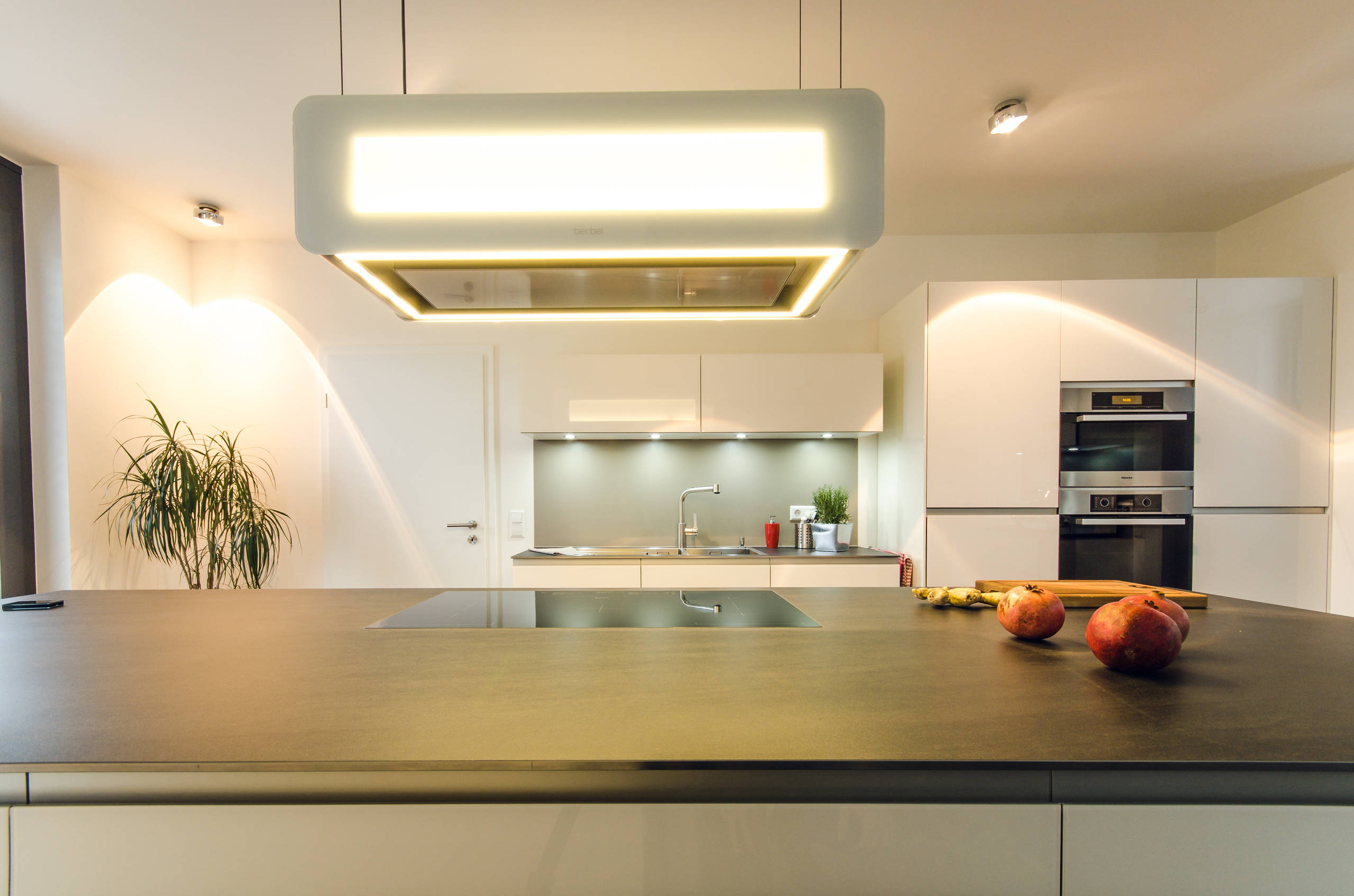 Einige moderne Dunstabzugshauben bringen die Beleuchtung gleich mit. Diese Inselhaube wirkt wie ein schwebendes Ufo und spendet nebenbei genügend arbeitstaugliches Licht. Im Arbeitsbereich der Küche empfiehlt sich eine Beleuchtungsstärke von etwa 500 Lux. Um diese Lichtintensität zu gewährleisten, kommt neben einer Dunstabzugshaube mit integriertem Licht oft noch eine zusätzliche Deckenbeleuchtung zum Einsatz.