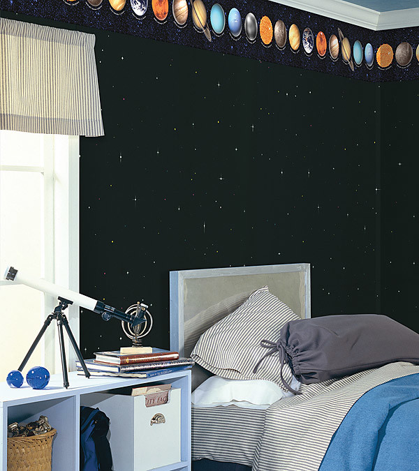Für einen Blick auf die Sternbilder kurz vorm Schlafengehen steht hier gleich neben dem Bett ein Teleskop bereit. Und sollten sich Wolken vor die Sterne schieben, bleibt ja immer noch die eigene Zimmerwand, die nach oben hin von einer Bordüre abgegrenzt wird. Hier finden wir auch die Planeten unseres Sonnensystems wieder – hübsch nebeneinander aufgereiht. Perfekt für schlaflose Nächte, in denen sich der hier wohnende Sternforscher nur noch entscheiden muss, ob er lieber die Planeten oder die Sterne an der Wand zählt.