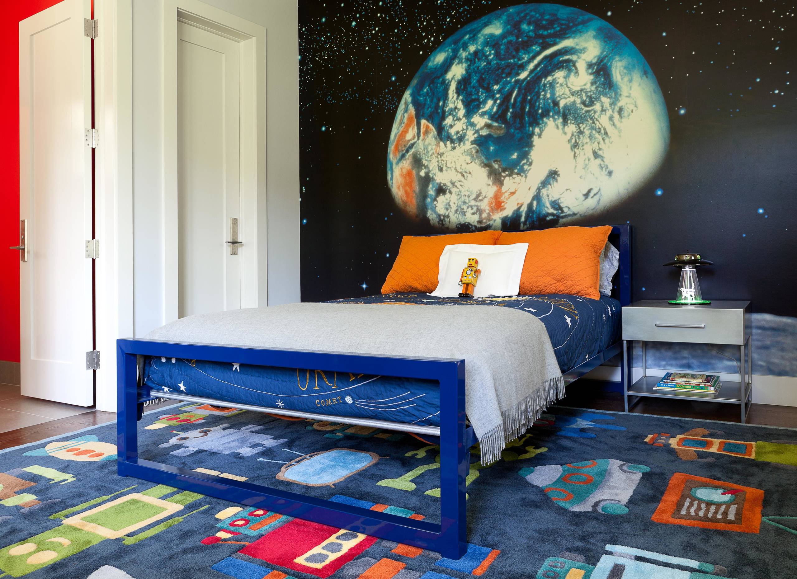 Fototapete sei dank kann sich der kleine Bewohner dieses Kinderzimmers in New York von dem Blick auf unseren blauen Planeten faszinieren lassen, ohne die Erdumlaufbahn verlassen zu müssen. Ebenfalls in passendem Blau: das schlichte Bett und die Bettwäsche mit Planetenmotiv.